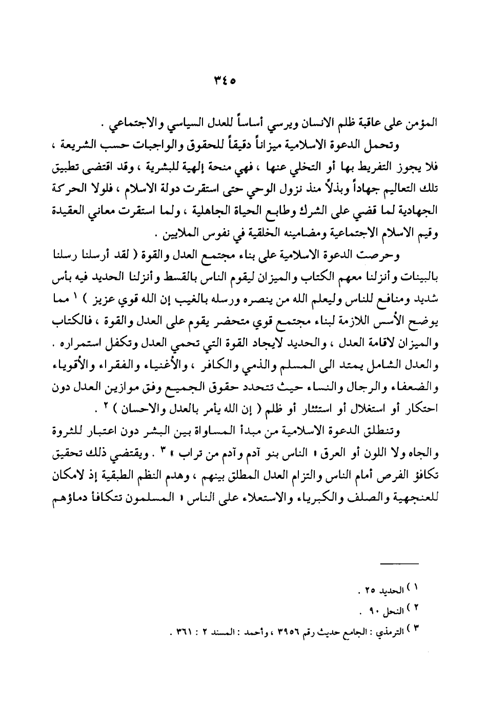 وحرصت الدعوة الاسلامية على بناء مجتمع العدل والقوة (لقد أرسلنا رسلنا بالبينات وأنزلنا معهم الكتاب والميزان ليقوم الناس بالقسط وأنزلنا الحديد فيه بأس شديد ومنافع للناس وليعلم الله من ينصره ورسله بالغيب إن الله قوي عزيز) (¬1) مما يوضح الأسس اللازمة لبناء مجتمع قوي متحضر يقوم على العدل والقوة، فالكتاب والميزان لإقامة العدل، والحديد لإيجاد القوة التي تحمي العدل وتكفل استمراره. والعدل الشامل يمتد إلى المسلم والذمي والكافر، والأغنياء والفقراء والأقوياء والضعفاء والرجال والنساء حيث تتحدد حقوق الجميع وفق موازين العدل دون احتكار أو استغلال أو استئثار أو ظلم (إن الله يأمر بالعدل والإحسان) (¬2).