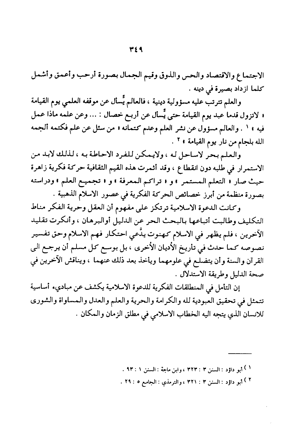 والعلم تترتب عليه مسؤولية دينية، فالعالم يُّسأل عن موقفه العلمي يوم القيامة "لا تزول قدما عبد يوم القيامة حتى يسأل عن أربع خصال: ... وعن علمه ماذا عمل فيه" (¬1). والعالم مسئول عن نشر العلم وعدم كتمانه "من سئل عن علم فكتمه ألجمه الله بلجام من نار يوم القيامة" (¬2).