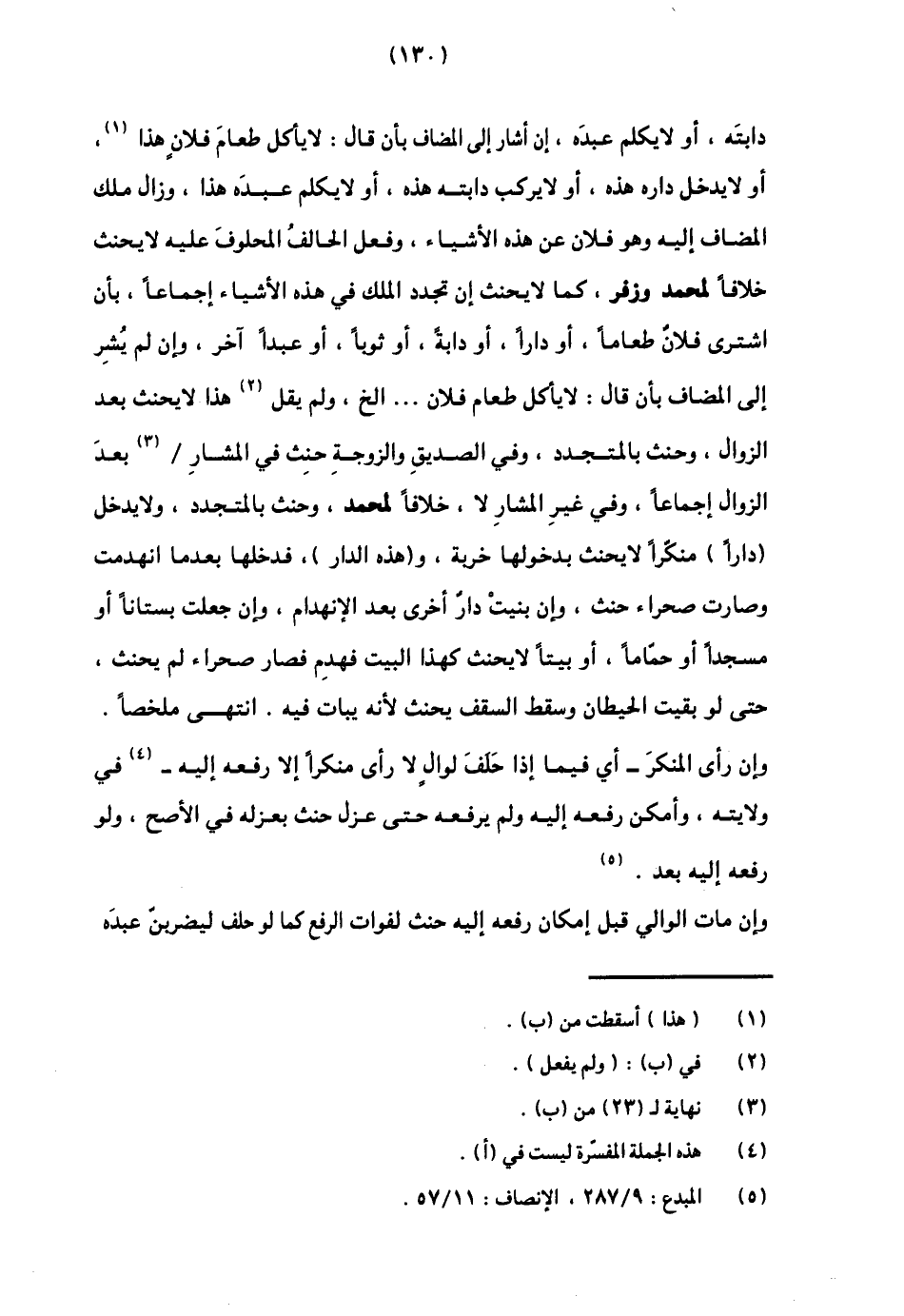 دابته، أو لا يكلم عبده، إن أشار إلى المضاف بأن قال: لا يأكل طعام فلان هذا1، أو لا يدخل داره هذه، أو لا يركب دابته هذه، أو لا يكلم عبده هذا، وزال ملك المضاف إليه وهو فلان عن هذه الأشياء، وفعل الحالف المحلوف عليه لا يحنث خلافا لمحمد وزفر، كما لا يحنث إن تجدد الملك في هذه الأشياء إجماعا، بأن اشترى فلان طعاما، أو دارا، أو ثوبا، أو عبدا آخر، وإن لم يشر إلى المضاف بأن قال: لا يأكل طعام فلان ... إلخ، ولم يقل2 هذا لا يحنث بعد الزوال، وحنث بالمتجدد، وفي الصديق والزوجة حنث في المشار/3 بعد الزوال إجماعا، وفي غير المشار لا، خلافا لمحمد، وحنث بالمتجدد، ولا يدخل (دارا) منكرا لا يحنث بدخولها خربة، و (هذه الدار) فدخلها بعدما انهدمت وصارت صحراء حنث، وإن بنيت دار أخرى بعد الانهدام، وإن جعلت بستانا أو مسجدا أو حماما، أو بيتا لا يحنث كهذا البيت فهدم فصار صحراء لم يحنث، حتى لو بقيت الحيطان وسقط السقف يحنث لأنه يبات فيه". انتهى ملخصا.