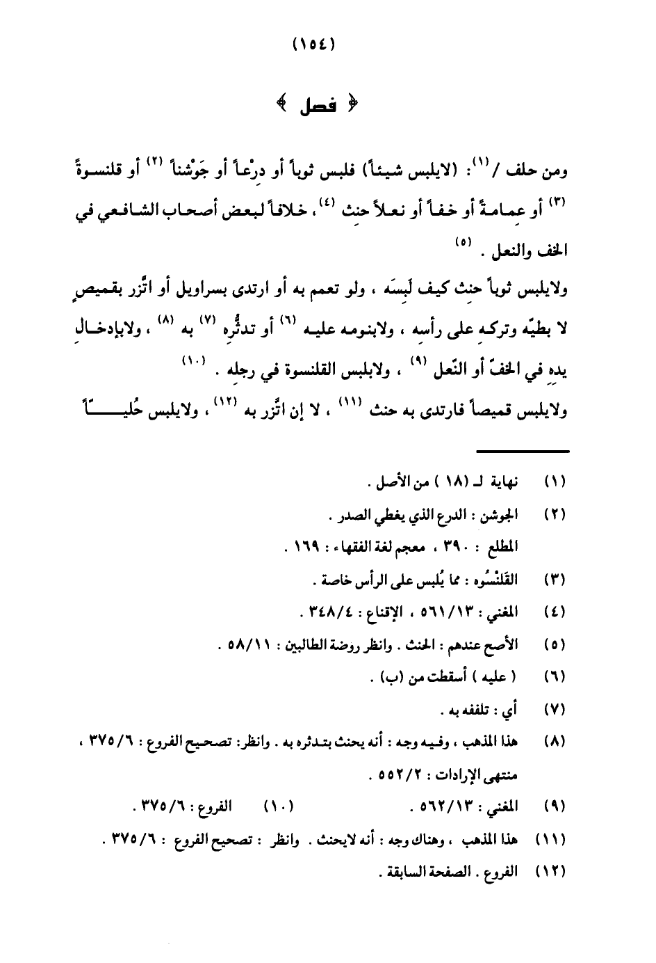 ولا يلبس ثوبا حنث كيف لبسه، ولو تعمم به أو ارتدى بسروايل أو اتزر بقميص لا بطيه وتركه على رأسه، ولا بنومه عليه6 أو تدثره7 به8، ولا بإدخال يده في الخف أو النعل9، ولا بلبس القلنسوة في رجله10.