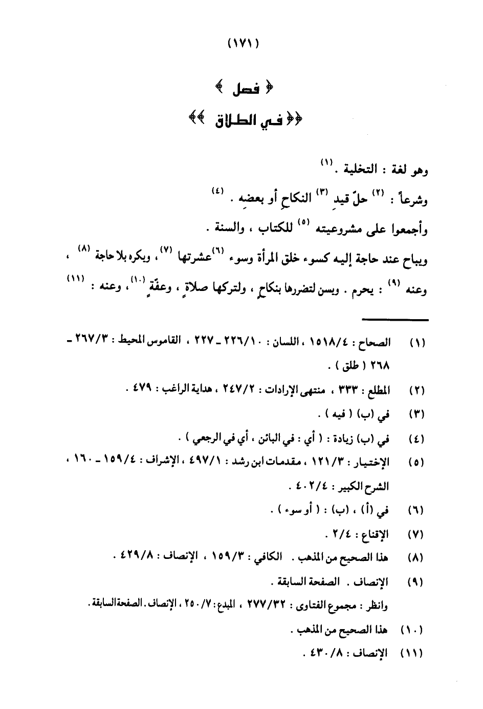 ويباح عند حاجة إليه كسوء خلق المرأة وسوء6 عشرتها7، ويكره بلا حاجة8، وعنه9: يحرم. ويسن لتضررها بنكاح، ولتركها صلاة، وعفة10، وعنه11: