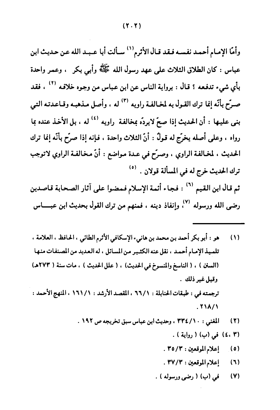 وأما الإمام أحمد نفسه فقد قال الأثرم1: "سألت أبا عبد الله عن حديث ابن عباس: كان الطلاق الثلاث على عهد رسول الله صلى الله عليه وسلم وأبي بكر، وعمر واحدة بأي شيء تدفعه؟ " قال: "برواية الناس عن ابن عباس من وجوه خلافه"2، فقد صرح بأنه إنما ترك القول به لمخالفة راويه3 له، وأصل مذهبه وقاعدته التي بنى عليها: أن الحديث إذا صح لا يرده بمخالفة راويه4 له، بل الأخذ عنده بما رواه، وعلى أصله يخرج له قول: أن الثلاث واحدة، فإنه إذا صرح بأنه إنما ترك الحديث لمخالفة الراوي، وصرح في عدة مواضع: أن مخالفة الراوي لا توجب ترك الحديث خرج له في المسألة قولان"5.