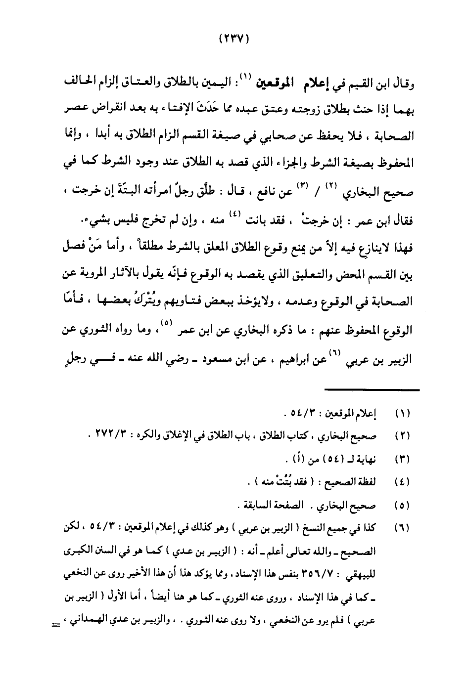 وقال ابن القيم في إعلام الموقعين1: "اليمين بالطلاق والعتاق إلزام الحالف بهما إذا حنث بطلاق زوجته وعتق عبده مما حدث الإفتاء به بعد انقراض عصر الصحابة، فلا يحفظ عن صحابي في صيغة القسم إلزام الطلاق به أبدا، وإنما المحفوظ بصيغة الشرط والجزاء الذي قصد به الطلاق عند وجود الشرط كما في صحيح البخاري2/3 عن نافع، قال: طلق رجل امرأته البتة إن خرجت، فقال ابن عمر: إن خرجت، فقد بانت4 منه وإن لم تخرج فليس بشيء".