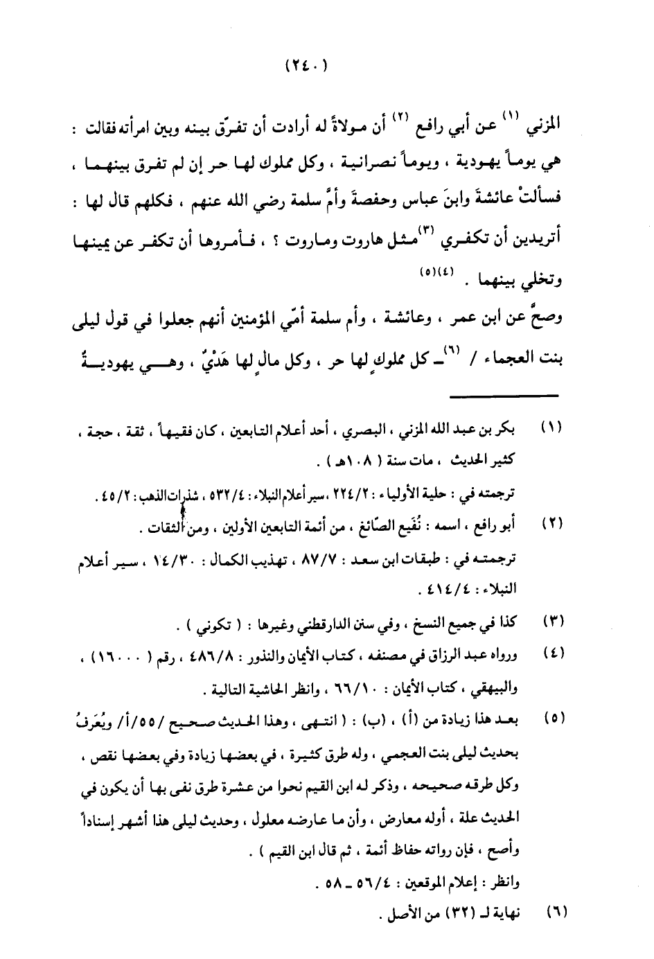 المزني1 عن أبي رافع2 أن مولاة له أرادت أن تفرق بينه وبين امرأته فقالت: هي يوما يهودية، ويوما نصرانية، وكل مملوك لها حر إن لم تفرق بينهما، فسألت عائشة وابن عباس وحفصة وأم سلمة رضي الله عنهم، فكلهم قال لها: "أتريدين أن تكفري3 مثل هاروت وماروت؟ " فأمروها أن تكفر عن يمينها وتخلي بينهما4.5