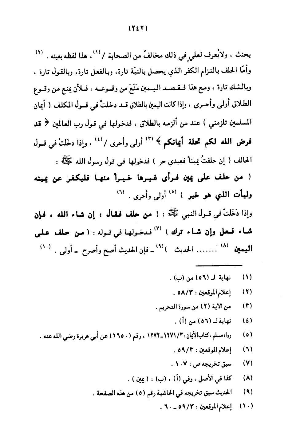 وأما الحلف بالتزام الكفر الذي يحصل بالنية تارة، وبالفعل تارة، وبالقول تارة، وبالشك تارة، ومع هذا فقصد اليمين منع من وقوعه، فلأن يمنع من وقوع الطلاق أولى وأحرى، وإذا كانت اليمين بالطلاق قد دخلت في قول المكلف "أيمان المسلمين تلزمني" عند من ألزمه بالطلاق، فدخولها في قول رب العالمين {قَدْ فَرَضَ اللَّهُ لَكُمْ تَحِلَّةَ أَيْمَانِكُمْ} 3 أولى وأحرى/4، وإذا دخلت في قول الحالف "إن حلفت يمينا فعبدي حر" فدخولها في قول رسول الله صلى الله عليه وسلم: "من حلف يمينا فرأى غيرها خيرا منها فليكفر عن يمينه وليأت الذي هو خير" 5 أولى وأحرى6.