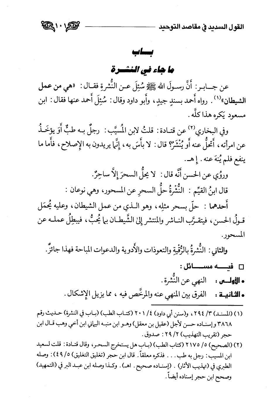عن جابر: أن رسول الله صلى الله عليه وسلم سئل عن النشرة فقال: "هي من عمل الشيطان" 1. رواه أحمد بسند جيد، وأبو داود وقال: سئل أحمد عنها فقال: ابن مسعود يكره هذا كله. وفي البخاري2 عن قتادة: قلت لابن المسيب: "رجل به طب أو يؤخذ عن امرأته، أتحل عنه أو ينشر؟ قال: لا بأس به، إنما يريدون به الإصلاح، فأما ما ينفع فلم ينه عنه" اهـ.