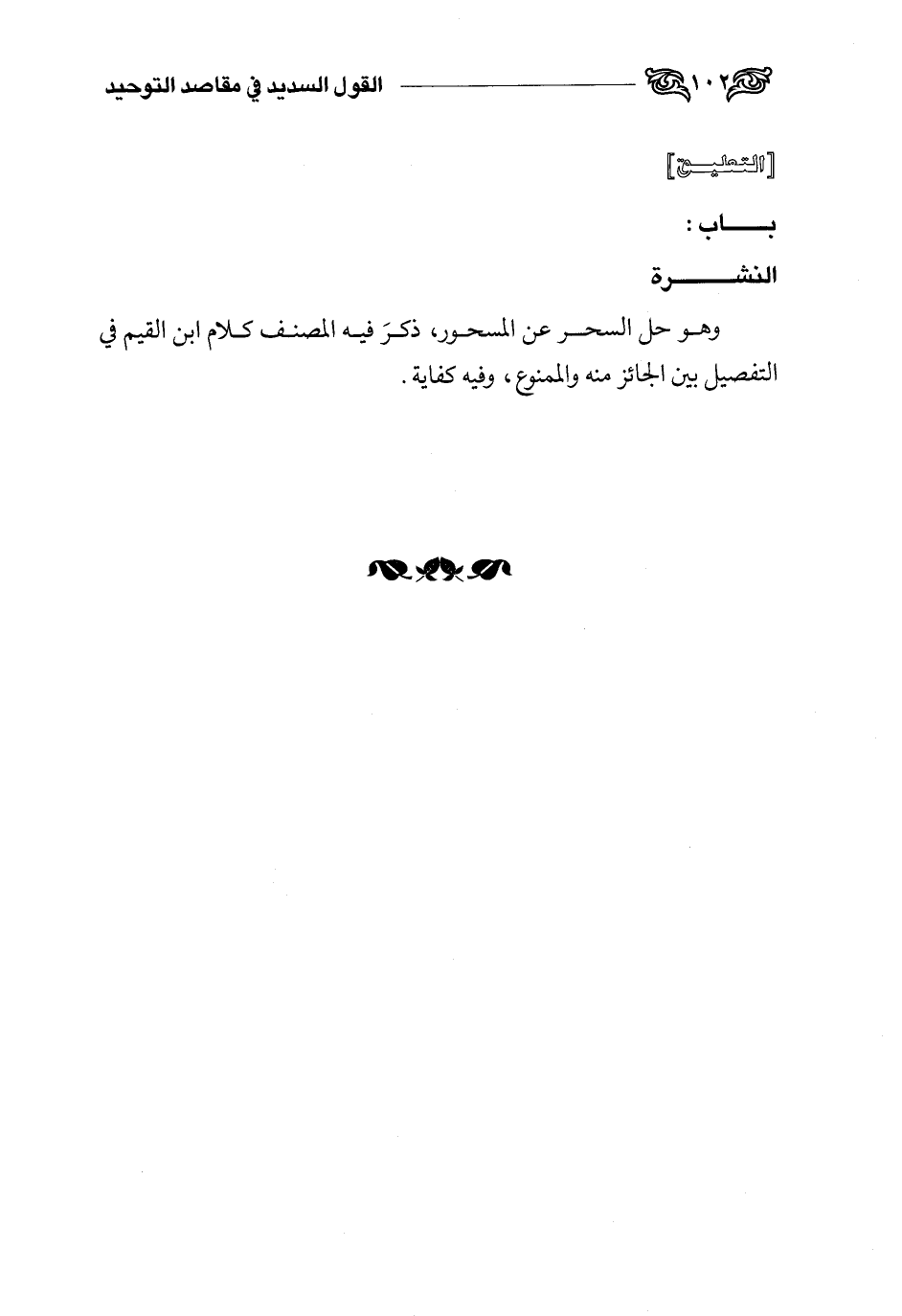 وهو حل السحر عن المسحور، ذكر فيه المصنف كلام ابن القيم في التفصيل بين الجائز منه والممنوع، وفيه كفاية.