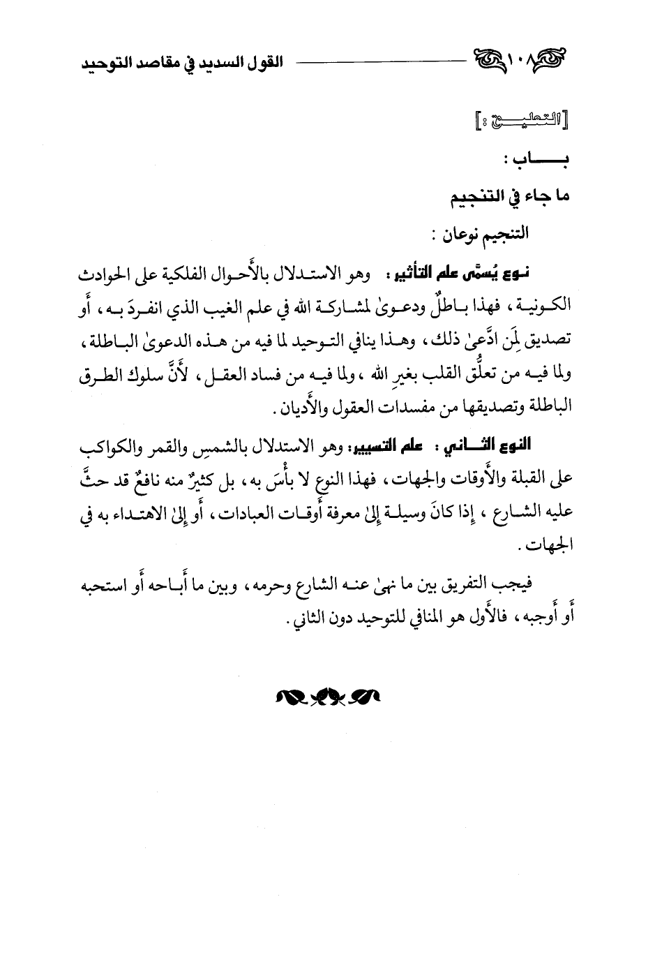 النوع الثاني: علم التسيير: وهو الاستدلال بالشمس والقمر والكواكب على القبلة والأوقات والجهات، فهذا النوع لا بأس به، بل كثير منه نافع قد حث عليه الشارع، إذا كان وسيلة إلى معرفة أوقات العبادات، أو إلى الاهتداء به في الجهات. فيجب التفريق بين ما نهى عنه الشارع وحرمه، وبين ما أباحه أو استحبه أو أوجبه، فالأول هو المنافي للتوحيد دون الثاني.