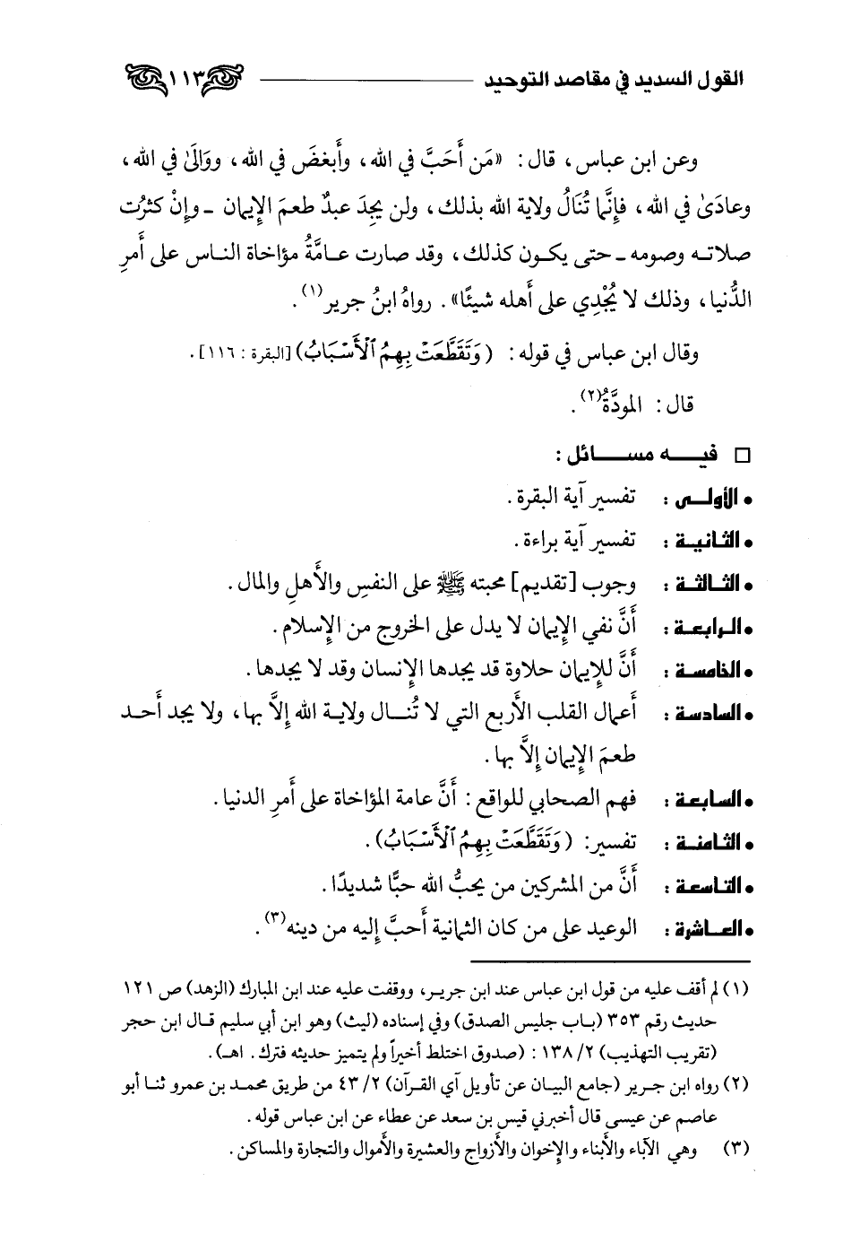 وعن ابن عباس قال: "من أحب في الله، وأبغض في الله، ووالى في الله، وعادى في الله، فإنما تنال ولاية الله بذلك، ولن يجد عبد طعم الإيمان- وإن كثرت صلاته وصومه- حتى يكون كذلك. وقد صارت عامة مؤاخاة الناس على أمر الدنيا، وذلك لا يجدي على أهله شيئا" رواه ابن جرير1. وقال ابن عباس في قوله: {وَتَقَطَّعَتْ بِهِمُ الأَسْبَابُ} 2 قال: المودة3.