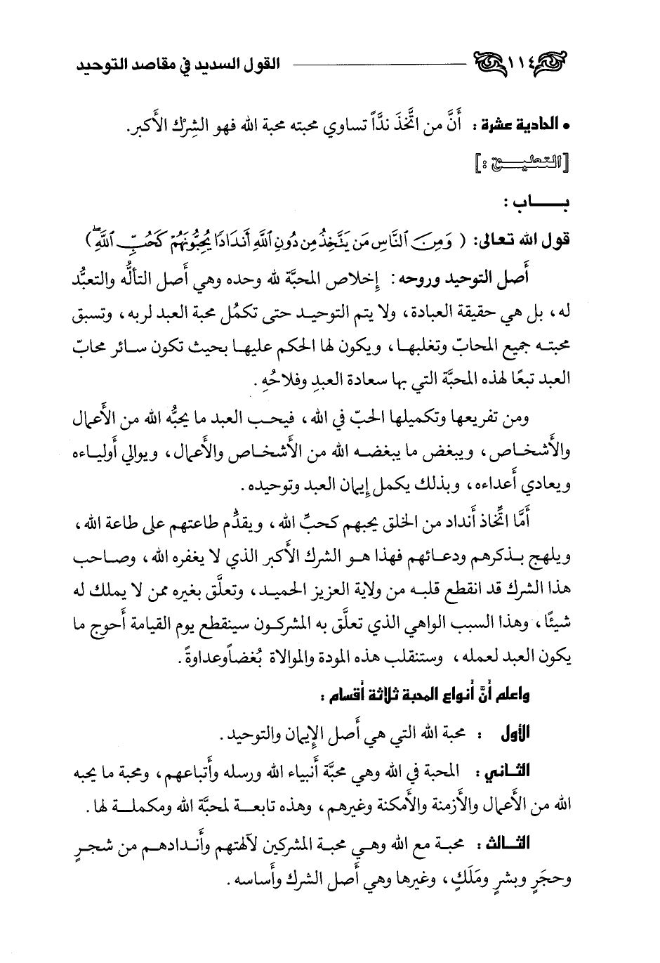 أصل التوحيد وروحه: إخلاص المحبة لله وحده، وهي أصل التأله والتعبد له، بل هي حقيقة العبادة، ولا يتم التوحيد حتى تكمل محبة العبد لربه، وتسبق محبته جميع المحاب وتغلبها، ويكون لها الحكم عليها بحيث تكون سائر محاب العبد تبعا لهذه المحبة التي بها سعادة العبد وفلاحه. ومن تفريعها وتكميلها الحب في الله، فيحب العبد ما يحبه الله من الأعمال والأشخاص، ويبغض ما يبغضه الله من الأشخاص والأعمال، ويوالي أولياءه ويعادي أعداءه، وبذلك يكمل إيمان العبد وتوحيده.