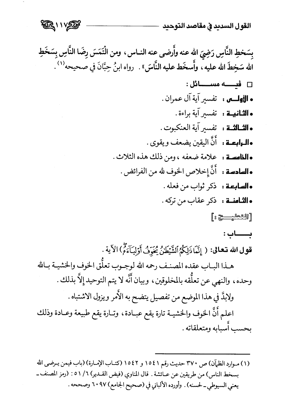 هذا الباب عقده المصنف - رحمه الله - لوجوب تعلق الخوف والخشية بالله وحده، والنهي عن تعلقه بالمخلوقين، وبيان أنه لا يتم التوحيد إلا بذلك. ولا بد في هذا الموضع من تفصيل يتضح به الأمر ويزول الاشتباه. اعلم أن الخوف والخشية تارة يقع عبادة، وتارة يقع طبيعة وعادة وذلك بحسب أسبابه ومتعلقاته.