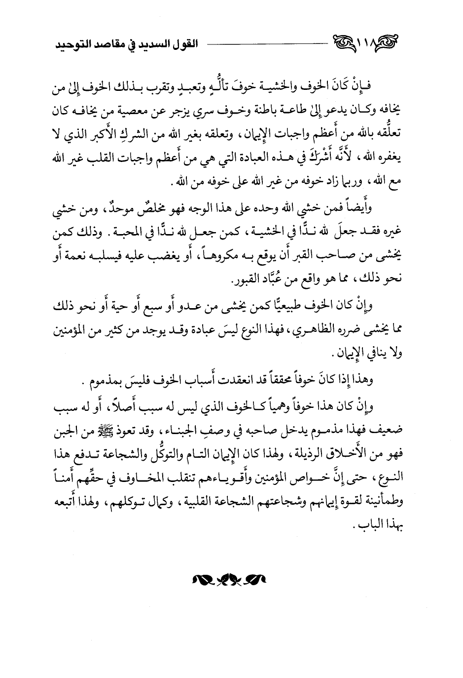 فإن كان الخوف والخشية خوف تأله وتعبد، وتقرب بذلك الخوف إلى من يخافه، وكان يدعو إلى طاعة باطنة وخوف سري يزجر عن معصية من يخافه، كان تعلقه بالله من أعظم واجبات الإيمان، وتعلقه بغير الله من الشرك الأكبر الذي لا يغفره الله ; لأنه أشرك في هذه العبادة التي هي من أعظم واجبات القلب غير الله مع الله، وربما زاد خوفه من غير الله على خوفه من الله. وأيضا فمن خشي الله وحده على هذا الوجه فهو مخلص موحد، ومن خشي غيره فقد جعل لله ندا في الخشية، كمن جعل لله ندا في المحبة. وذلك كمن يخشى من صاحب القبر أن يوقع به مكروها، أو يغضب عليه فيسلبه نعمة أو نحو ذلك، مما هو واقع من عباد القبور. وإن كان الخوف طبيعيا كمن يخشى من عدو أو سبع أو حية أو نحو ذلك مما يخشى ضرره الظاهري، فهذا النوع ليس عبادة، وقد يوجد من كثير من المؤمنين ولا ينافي الإيمان. وهذا إذا كان خوفا محققا قد انعقدت أسباب الخوف فليس بمذموم. وإن كان هذا خوفا وهميا كالخوف الذي ليس له سبب أصلا، أو له سبب ضعيف فهذا مذموم يدخل صاحبه في وصف الجبناء، وقد تعوذ صلى الله عليه وسلم من الجبن فهو من الأخلاق الرذيلة، ولهذا كان الإيمان التام والتوكل والشجاعة تدفع هذا النوع، حتى إن خواص المؤمنين وأقوياءهم تنقلب المخاوف في حقهم أمنا، وطمأنينة لقوة إيمانهم وشجاعتهم الشجاعة القلبية، وكمال توكلهم، ولهذا أتبعه بهذا الباب.