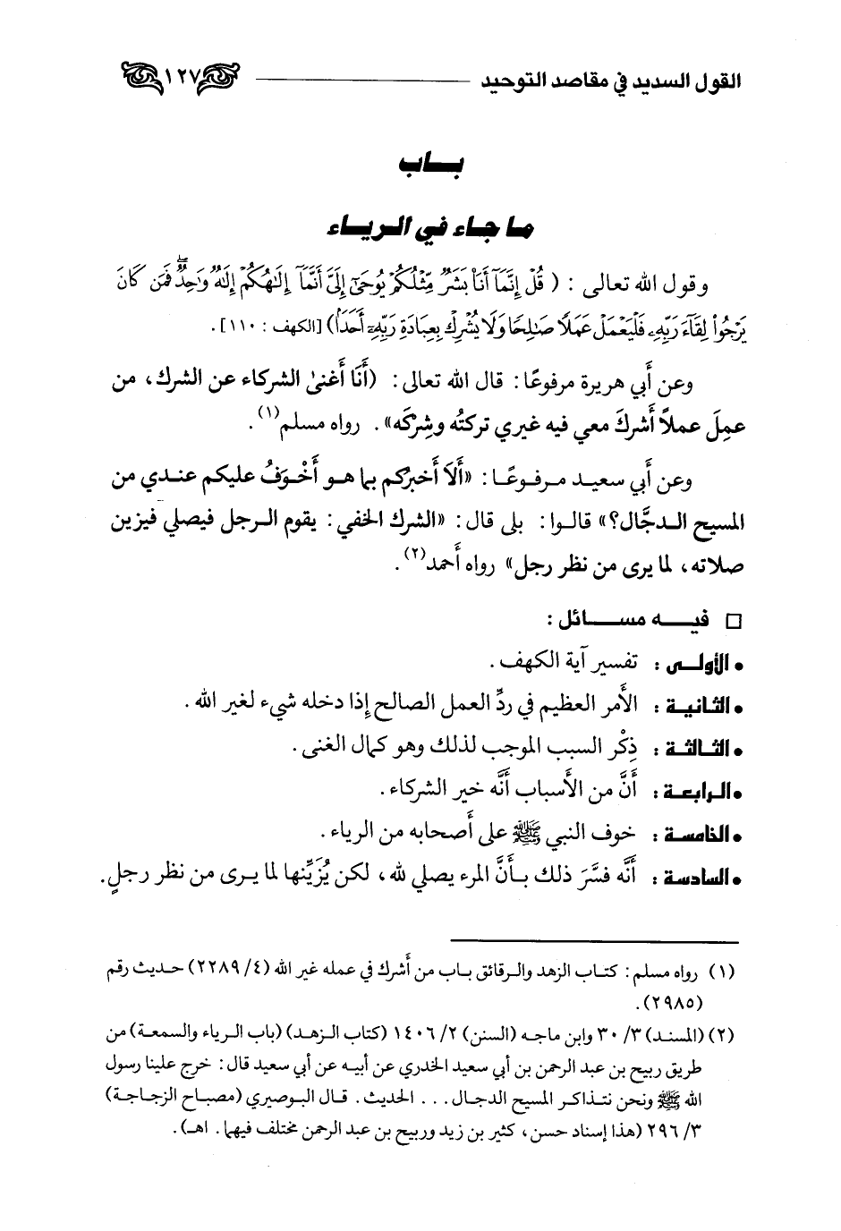وعن أبي سعيد مرفوعا: "ألا أخبركم بما هو أخوف عليكم عندي من المسيح الدجال؟ قالوا: بلى. قال: الشرك الخفي: يقوم الرجل فيصلي فيزين صلاته، لما يرى من نظر رجل" رواه أحمد3.