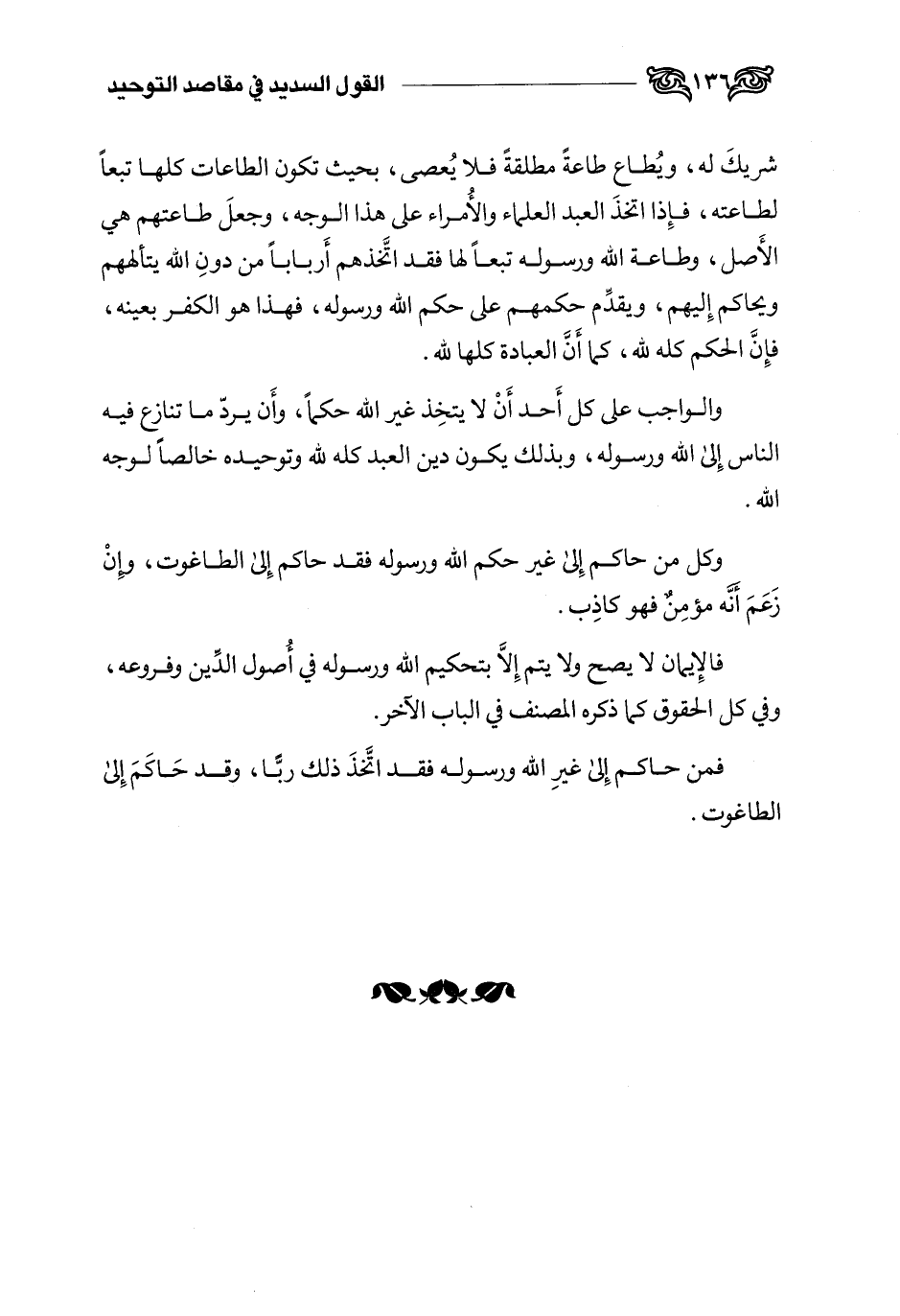 شريك له، ويطاع طاعة مطلقة فلا يعصى، بحيث تكون الطاعات كلها تبعا لطاعته، فإذا اتخذ العبد العلماء والأمراء على هذا الوجه، وجعل طاعتهم هي الأصل، وطاعة الله ورسوله تبعا لها فقد اتخذهم أربابا من دون الله يتألههم ويحاكم إليهم، ويقدم حكمهم على حكم الله ورسوله، فهذا هو الكفر بعينه؛ فإن الحكم كله لله، كما أن العبادة كلها لله.