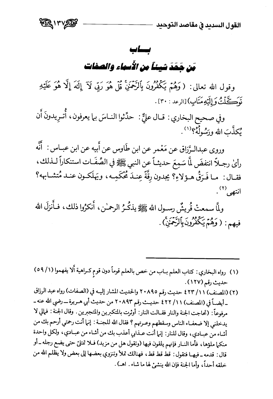 وقول الله تعالى: {وَهُمْ يَكْفُرُونَ بِالرَّحْمَنِ قُلْ هُوَ رَبِّي لا إِلَهَ إِلاَّ هُوَ عَلَيْهِ تَوَكَّلْتُ وَإِلَيْهِ مَتَابِ} 1. وفي صحيح البخاري: قال علي: "حدثوا الناس بما يعرفون، أتريدون أن يكذب الله ورسوله؟ " 2. وروى عبد الرزاق عن معمر عن ابن طاوس عن أبيه عن "ابن عباس: أنه رأى رجلا انتفض لما سمع حديثا عن النبي صلى الله عليه وسلم في الصفات استنكارا لذلك، فقال: ما فرق هؤلاء؟ يجدون رقة عند محكمه، ويهلكون عند متشابهه؟ "انتهى3. ولما سمعت قريش رسول الله صلى الله عليه وسلم يذكر الرحمن، أنكروا ذلك، فأنزل الله فيهم: {وَهُمْ يَكْفُرُونَ بِالرَّحْمَنِ} 4.