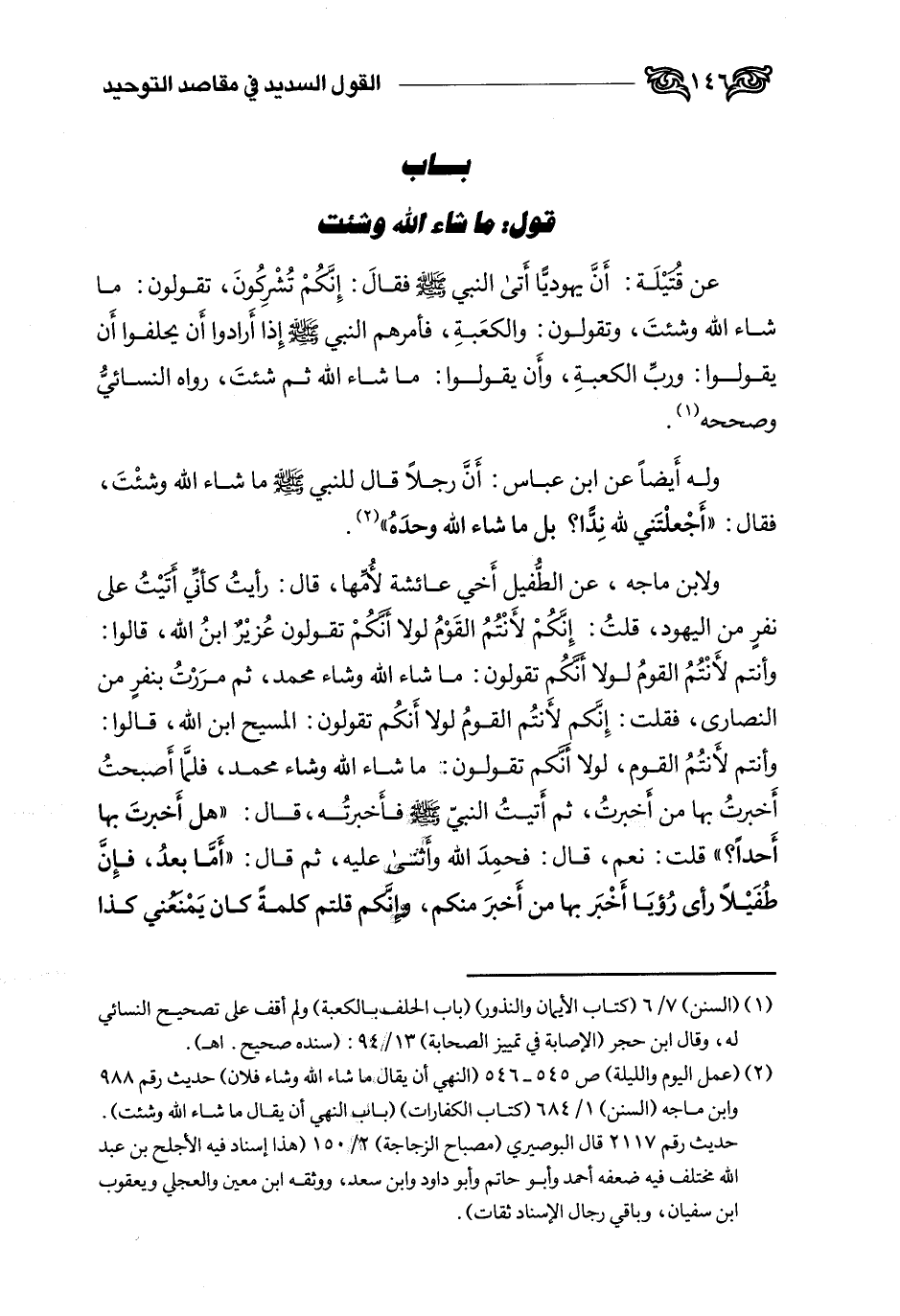 وله أيضا عن ابن عباس: "أن رجلا قال للنبي صلى الله عليه وسلم: ما شاء الله وشئت. فقال: أجعلتني لله ندا؟ بل ما شاء الله وحده" 2 ولابن ماجه، عن الطفيل أخي عائشة لأمها، قال: "رأيت كأني أتيت على نفر من اليهود، قلت: إنكم لأنتم القوم، لولا أنكم تقولون عزير ابن الله، قالوا: وأنتم لأنتم القوم، لولا أنكم تقولون: ما شاء الله وشاء محمد. ثم مررت بنفر من النصارى، فقلت: إنكم لأنتم القوم لولا أنكم تقولون: المسيح ابن الله. قالوا: وأنتم لأنتم القوم، لولا أنكم تقولون: ما شاء الله وشاء محمد. فلما أصبحت أخبرت بها من أخبرت. ثم أتيت النبي صلى الله عليه وسلم فأخبرته. قال: هل أخبرت بها أحدا؟ قلت: نعم. قال: فحمد الله وأثنى عليه، ثم قال: أما بعد، فإن طفيلا رأى رؤيا أخبر بها من أخبر منكم، وإنكم قلتم كلمة كان يمنعني كذا