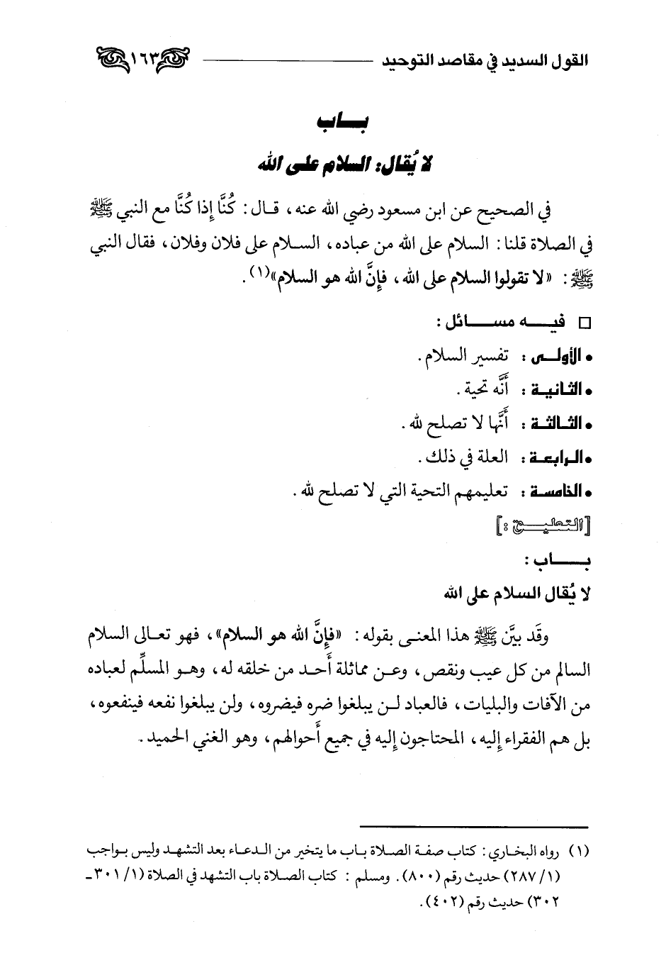 في الصحيح عن ابن مسعود رضي الله عنه قال: كنا إذا كنا مع النبي صلى الله عليه وسلم في الصلاة قلنا: السلام على الله من عباده، السلام على فلان وفلان. فقال النبي صلى الله عليه وسلم: "لا تقولوا السلام على الله، فإن الله هو السلام" 1.