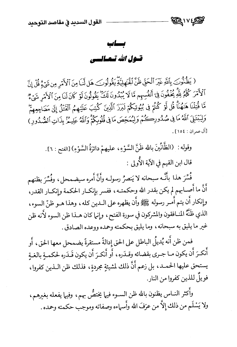 "فسر هذا بأنه سبحانه لا ينصر رسوله وأن أمره سيضمحل، وفسر بظنهم أن ما أصابهم لم يكن بقدر الله وحكمته، ففسر بإنكار الحكمة وإنكار القدر، وإنكار أن يتم أمر رسوله صلى الله عليه وسلم وأن يظهره على الدين كله، وهذا هو ظن السوء، الذي ظنه المنافقون والمشركون في سورة الفتح، وإنما كان هذا ظن السوء؛ لأنه ظن غير ما يليق به سبحانه، وما يليق بحكمته وحمده ووعده الصادق.