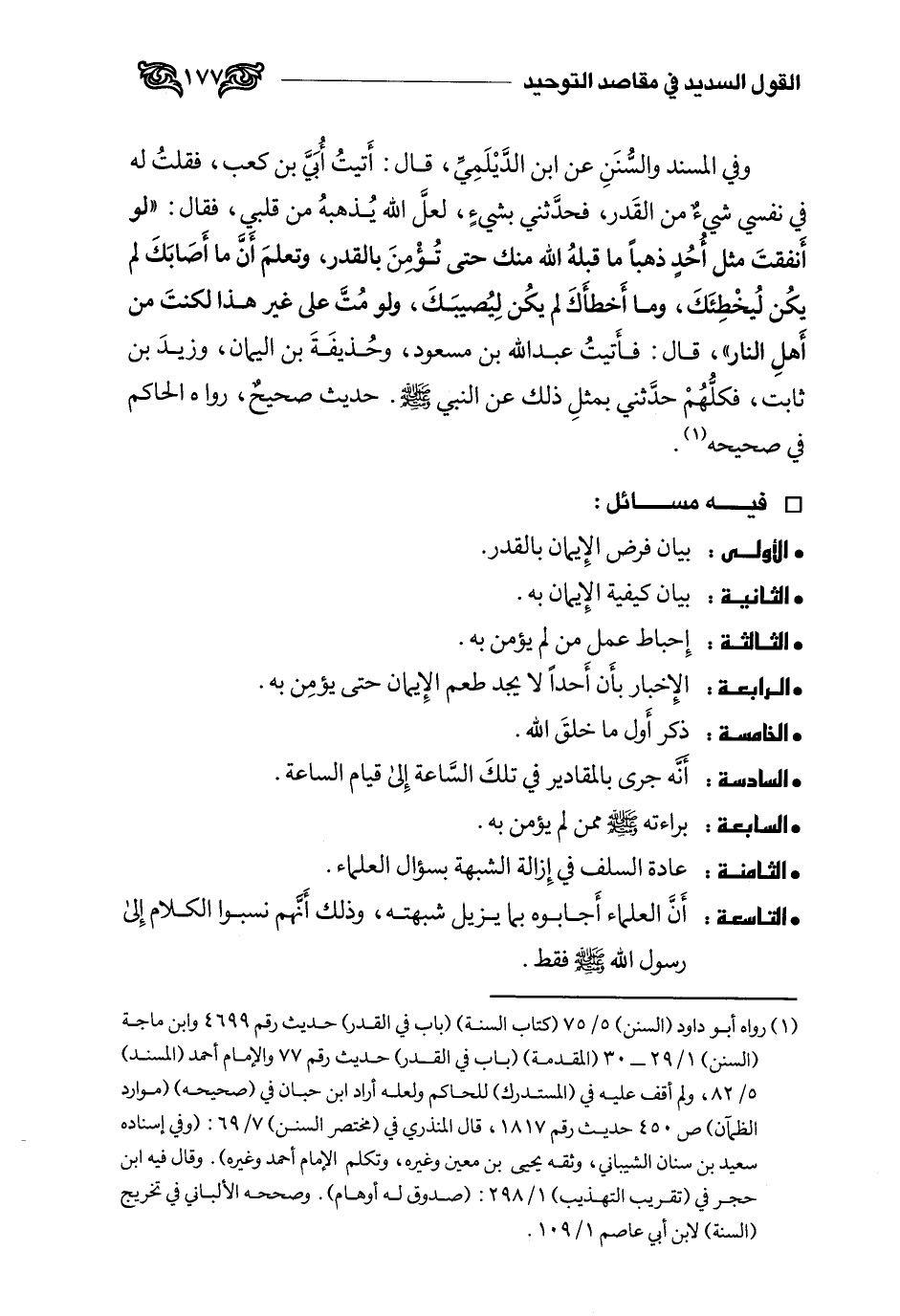 1 رواه أبو داود (السنن) 5 /75 (كتاب السنة) (باب في القدر) حديث رقم (4699) . وابن ماجه (السنن) 1 /29-30 (المقدمة) (باب في القدر) حديث رقم (77) . والإمام أحمد (المسند) 5 /82. ولم أقف عليه في (المستدرك) للحاكم ولعله أراد ابن حبان في (صحيحه) (موارد الظمآن) ص450 حديث رقم (1817) . قال المنذري في (مختصر السنن) 7 /69: (وفي إسناده سعيد بن سنان الشيباني, وثقه يحيى بن معين وغيره, وتكلم الإمام أحمد وغيره) . وقال فيه ابن حجر في (تقريب التهذيب) 1 /298: (صدوق له أوهام) . وصححه الألباني في تخريج (السنة) لابن أبي عاصم 1 /109.