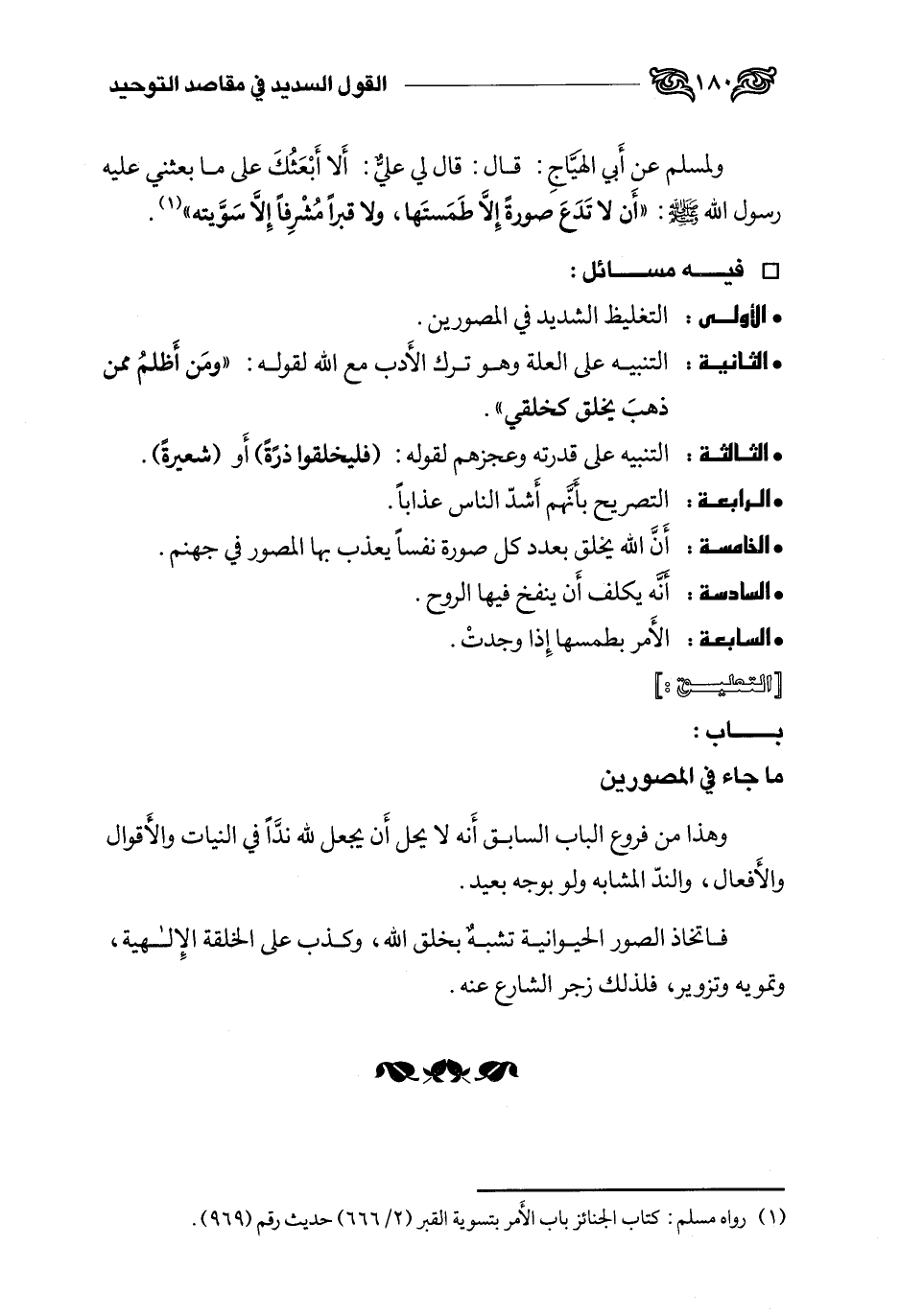 وهذا من فروع الباب السابق أنه لا يحل أن يجعل لله ندا في النيات والأقوال والأفعال، والند المشابه ولو بوجه بعيد. فاتخاذ الصور الحيوانية تشبه بخلق الله، وكذب على الخلقة الإلهية، وتمويه وتزوير، فلذلك زجر الشارع عنه.