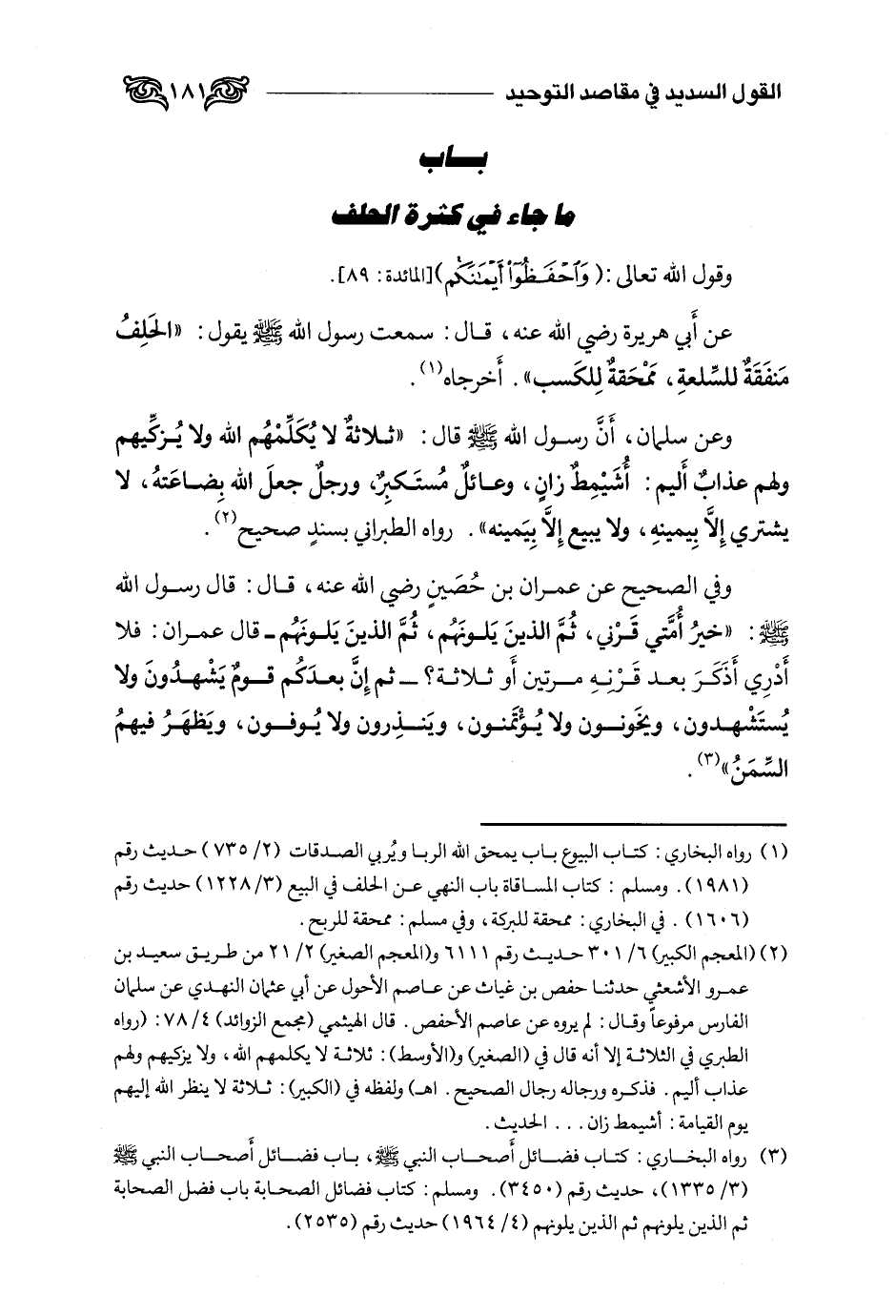 وعن سلمان، أن رسول الله صلى الله عليه وسلم قال: "ثلاثة لا يكلمهم الله ولا يزكيهم ولهم عذاب أليم: أشيمط زان، وعائل مستكبر، ورجل جعل الله بضاعته، لا يشتري إلا بيمينه، ولا يبيع إلا بيمينه" رواه الطبراني بسند صحيح3.