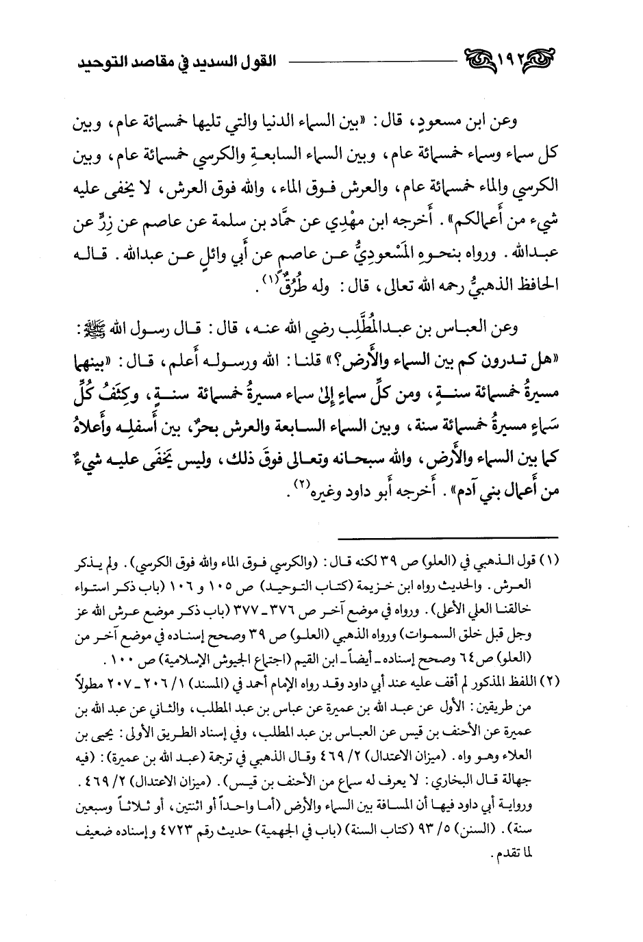 وعن ابن مسعود، قال: "بين السماء الدنيا والتي تليها خمسمائة عام، وبين كل سماء وسماء خمسمائة عام، وبين السماء السابعة والكرسي خمسمائة عام، وبين الكرسي والماء خمسمائة عام، والعرش فوق الماء، والله فوق العرش، لا يخفى عليه شيء من أعمالكم". أخرجه ابن مهدي عن حماد بن سلمة عن عاصم عن زر عن عبد الله، ورواه بنحوه المسعودي عن عاصم عن أبي وائل عن عبد الله. قاله الحافظ الذهبي - رحمه الله تعالى -، قال: وله طرق1.