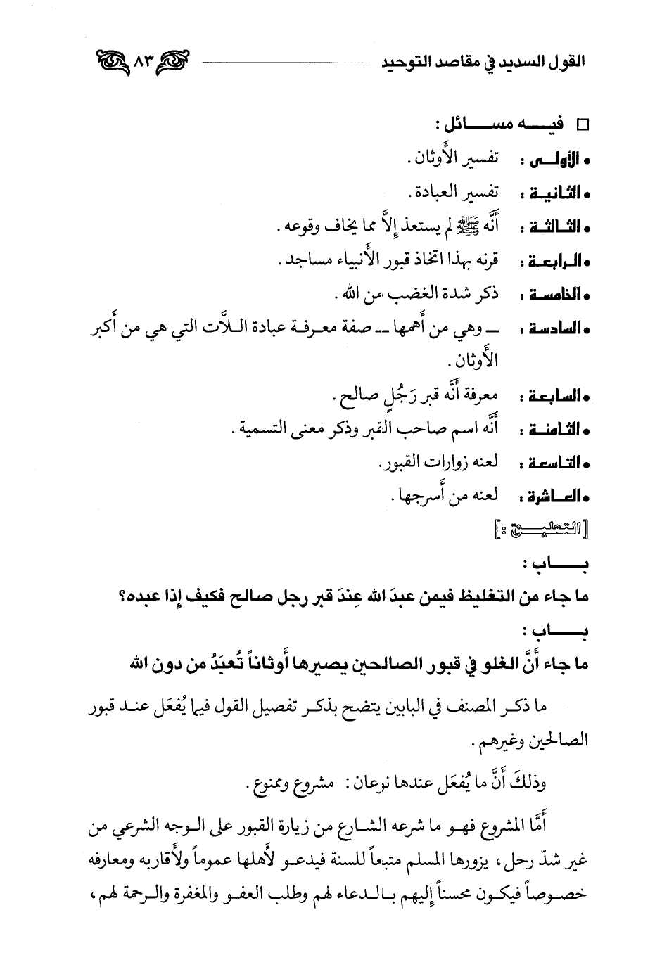 باب: ما جاء أن الغلو في قبور الصالحين يصيرها أوثانا تعبد من دون الله