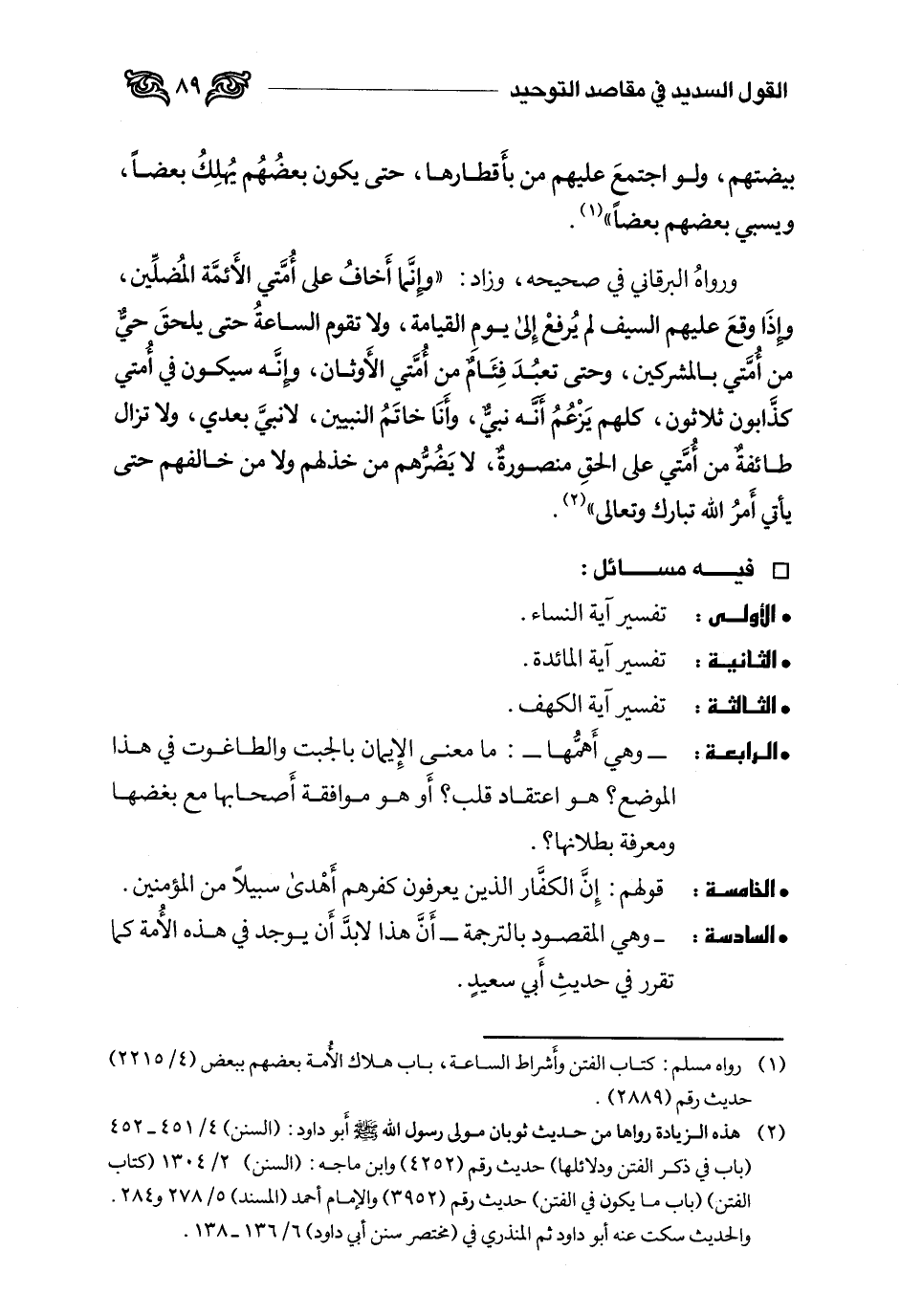 2 هذه الزيادة رواها من حديث ثوبان مولى رسول الله (أبو داود: (السنن) 4 / 451- 452 (باب في ذكر الفتن ودلائلها) حديث رقم (4252) . وابن ماجه: (السنن) 2 / 1304 (كتاب الفتن) (باب ما يكون في الفتن) حديث رقم (3952) . والإمام أحمد (المسند) 5 / 278 و 284. والحديث سكت عنه أبو داود ثم المنذري في (مختصر سنن أبي داود) 6 / 136- 138.