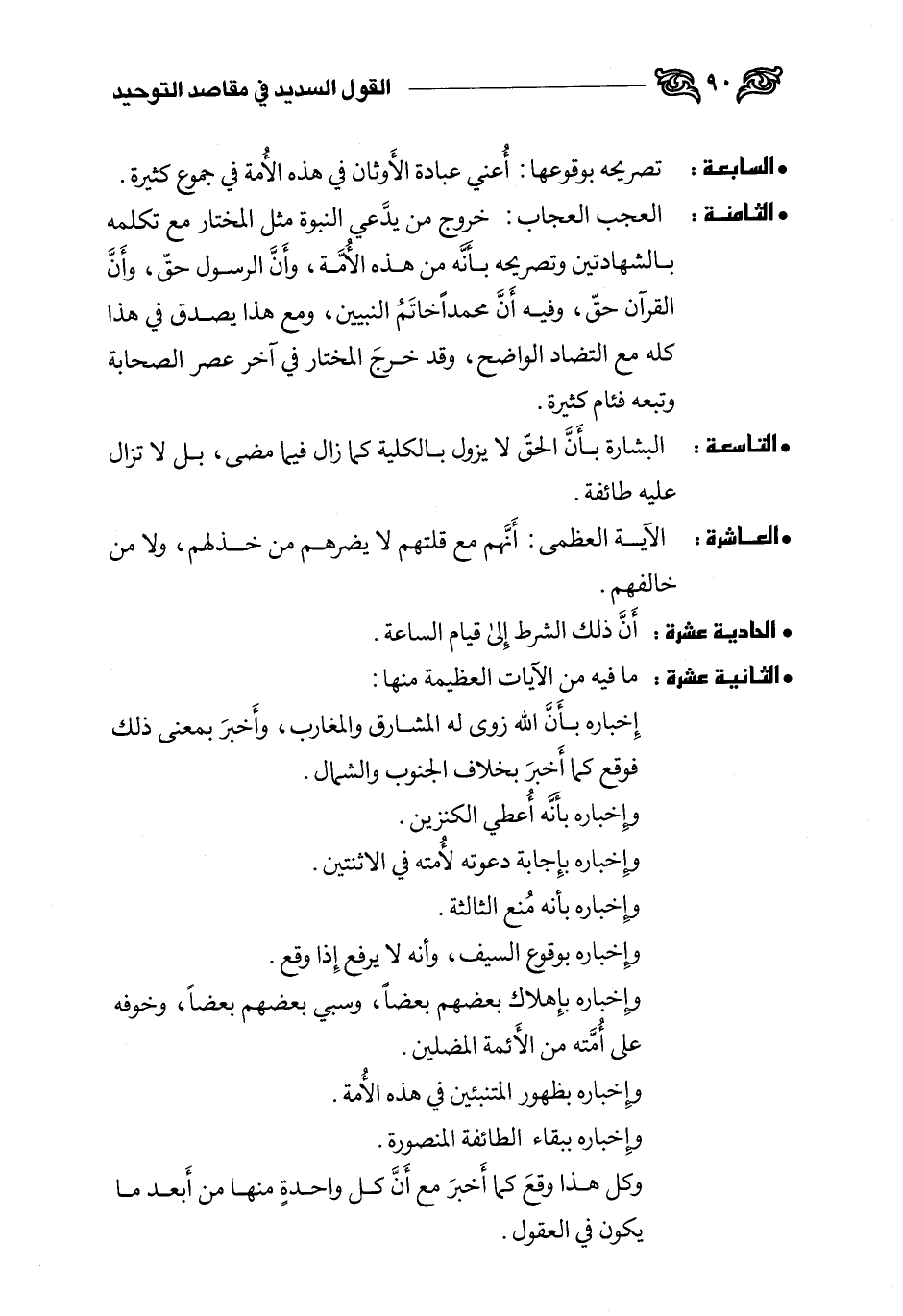 الثامنة: العجب العجاب: خروج من يدعي النبوة مثل المختار مع تكلمه بالشهادتين وتصريحه بأنه من هذه الأمة، وأن الرسول حق، وأن القرآن حق، وفيه أن محمدا خاتم النبيين، ومع هذا يصدق في هذا كله مع التضاد الواضح، وقد خرج المختار في آخر عصر الصحابة وتبعه فئام كثيرة.