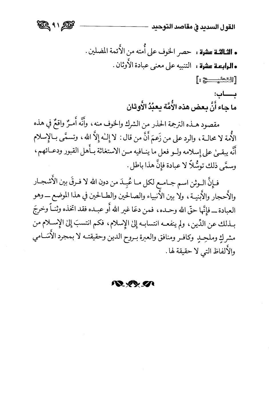 فإن الوثن اسم جامع لكل ما عبد من دون الله لا فرق بين الأشجار والأحجار والأبنية، ولا بين الأنبياء والصالحين والطالحين في هذا الموضع- وهو العبادة- فإنها حق الله وحده، فمن دعا غير الله أو عبده فقد اتخذه وثنا وخرج بذلك عن الدين، ولم ينفعه انتسابه إلى الإسلام، فكم انتسب إلى الإسلام من مشرك وملحد وكافر ومنافق، والعبرة بروح الدين وحقيقته لا بمجرد الأسامي والألفاظ التي لا حقيقة لها.