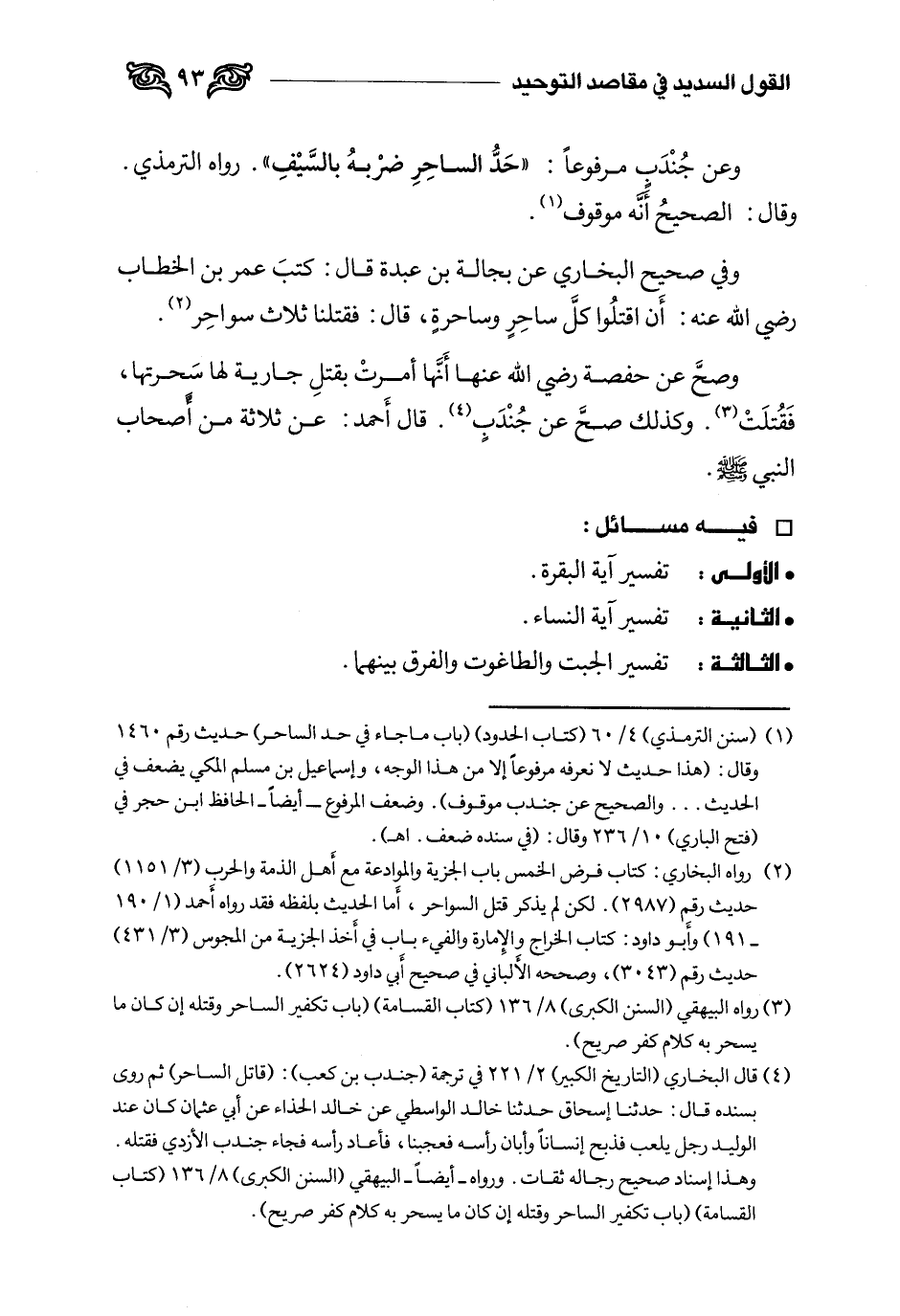 4 قال البخاري (التاريخ الكبير) 2 / 221 في ترجمة (جندب بن كعب) : (قاتل الساحر) . ثم روى بسنده قال: حدثنا إسحاق حدثنا خالد الواسطي عن خالد الحذاء عن أبي عثمان كان عند الوليد رجل يلعب، فذبح إنسانا وأبان رأسه فعجبنا, فأعاد رأسه فجاء جندب الأزدي فقتله. وهذا إسناد صحيح رجاله ثقات. ورواه- أيضا- البيهقي (السنن الكبرى) 8 / 136 (كتاب القسامة) (باب تكفير الساحر وقتله إن كان ما يسحر به كلام كفر صريح) .