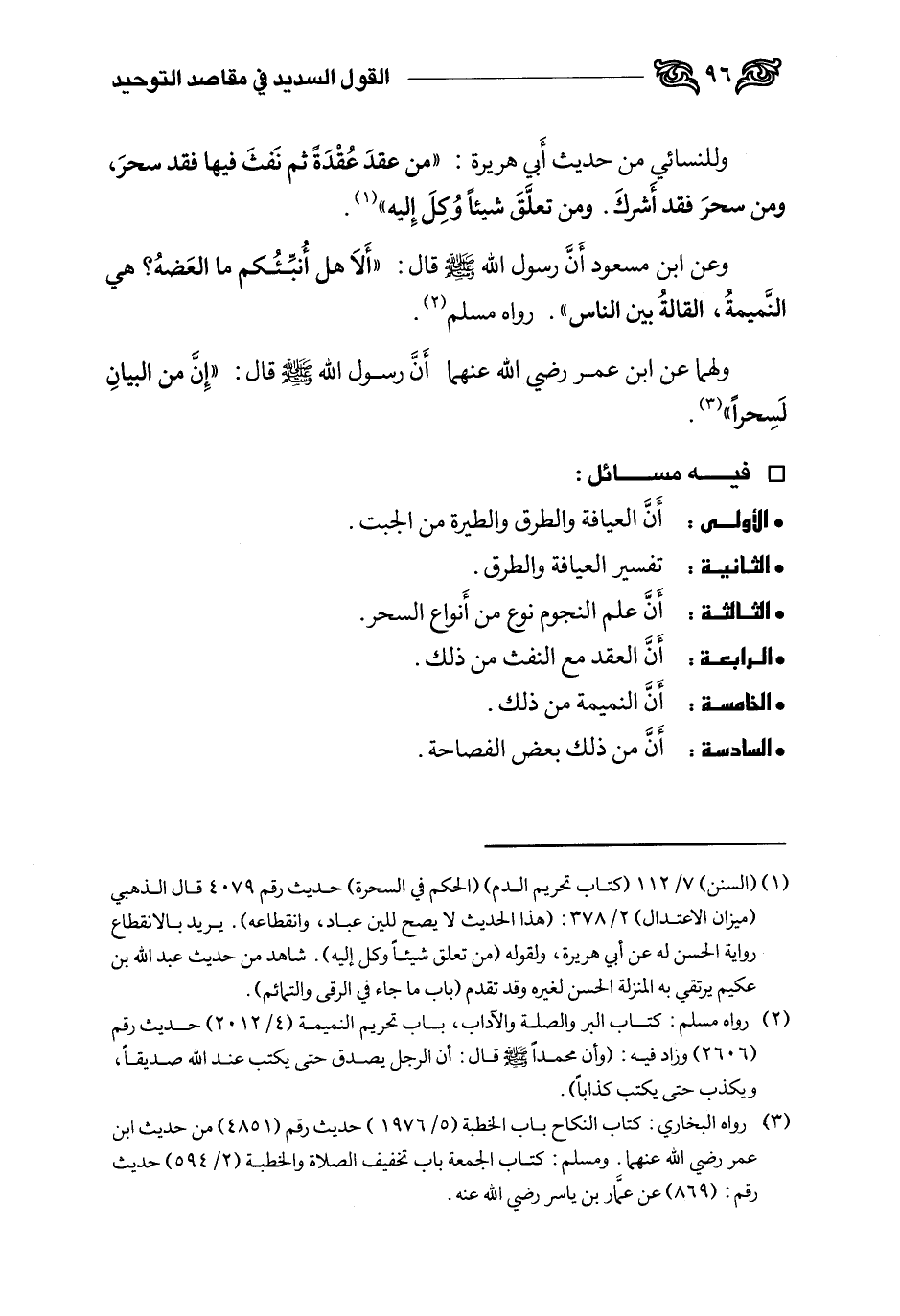 وللنسائي من حديث أبي هريرة: "من عقد عقدة ثم نفث فيها فقد سحر، ومن سحر فقد أشرك، ومن تعلق شيئا وُكِلَ إليه" 1. وعن ابن مسعود أن رسول الله صلى الله عليه وسلم قال: "ألا هل أنبئكم ما العضه؟ هي النميمة: القالة بين الناس" رواه مسلم2. ولهما عن ابن عمر - رضي الله عنهما - أن رسول الله صلى الله عليه وسلم قال: "إن من البيان لسحرا" 3.
