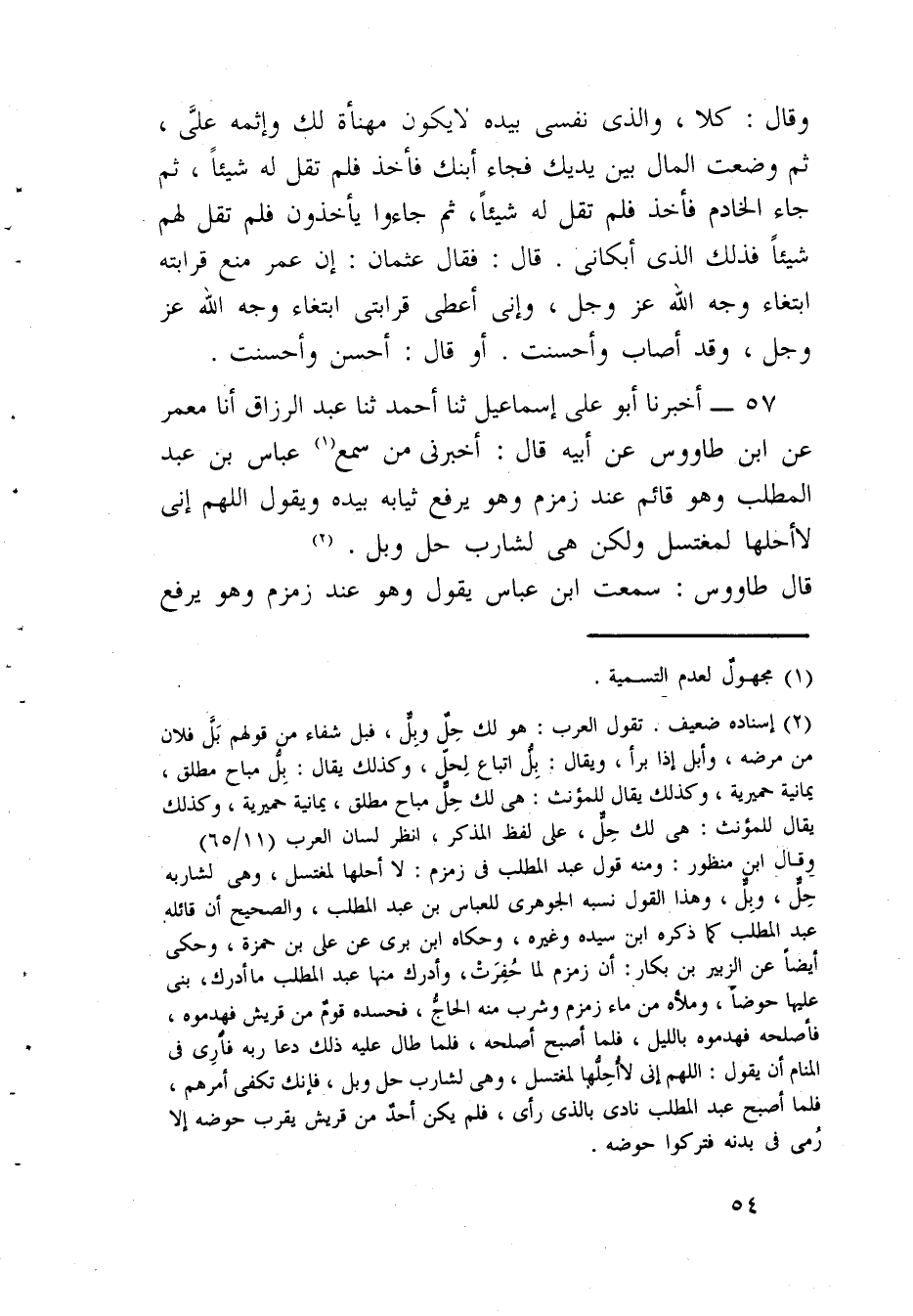 57 - أَخْبَرَنَا أَبُو عَلِيٍّ إِسْمَاعِيلُ، ثَنَا أَحْمَدُ، ثَنَا عَبْدُ الرَّزَاقِ، أنا مَعْمَرٌ، عَنِ ابْنِ طَاوُوسٍ، عَنْ أَبِيهِ، قَالَ: أَخْبَرَنِي مَنْ سَمِعَ عَبَّاسَ بْنَ عَبْدِ الْمُطَّلِبِ، وَهُوَ قَائِمٌ عِنْدَ زَمْزَمَ وَهُوَ يَرْفَعُ ثِيَابَهُ بِيَدِهِ وَيَقُولُ: §اللَّهُمَّ إِنَّى لَا أُحِلُّهَا لِمُغْتَسِلٍ وَلَكِنْ هِيَ لِشَارِبٍ حِلٌّ وَبِلٌّ. قَالَ طَاوُوسٌ: سَمِعْتُ ابْنَ عَبَّاسٍ يَقُولُ وَهُوَ عِنْدَ زَمْزَمَ وَهُوَ يَرْفَعُ -[55]- ثِيَابَهُ هِيَ لِشَارِبٍ وَمُتَوَضِّئٍ حِلٌّ وَبِلٌّ
