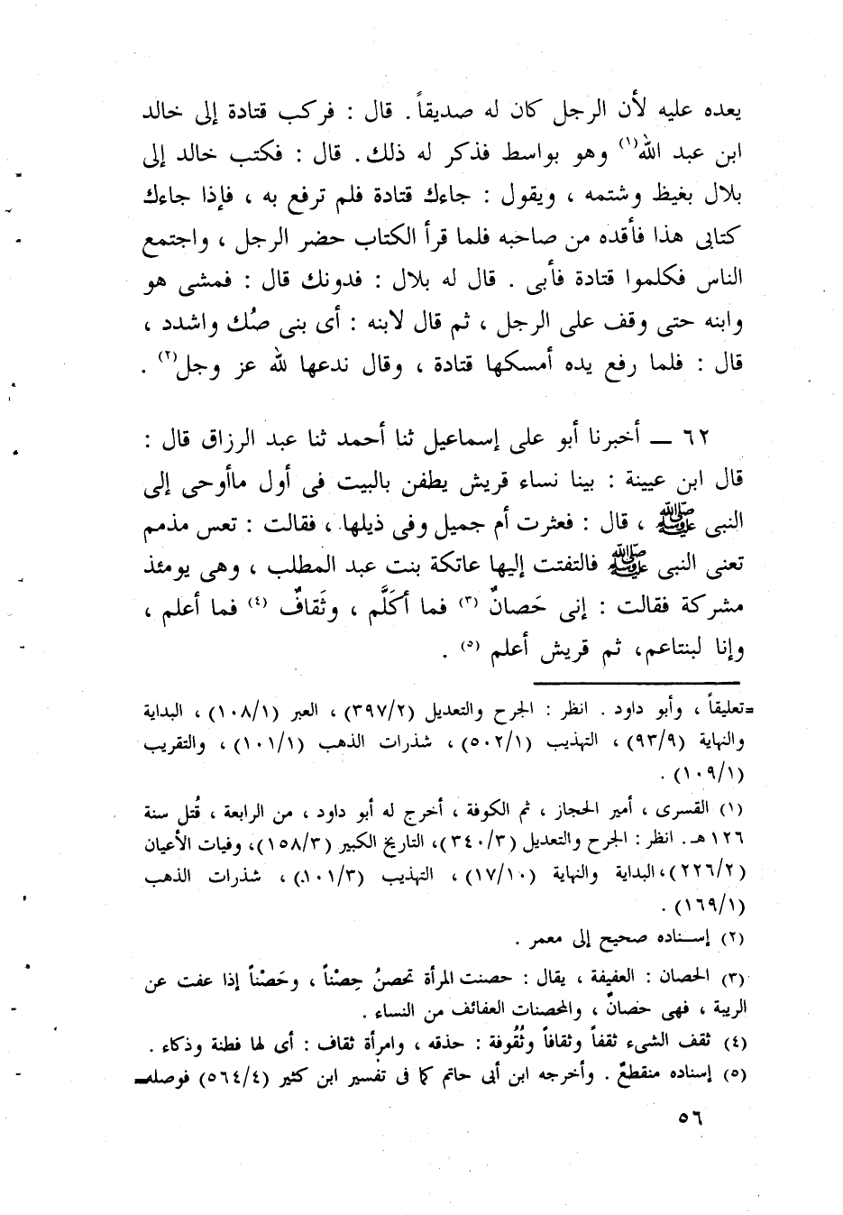 62 - أَخْبَرَنَا أَبُو عَلِيٍّ إِسْمَاعِيلُ، ثَنَا أَحْمَدُ، ثَنَا عَبْدُ الرَّزَاقِ، قَالَ: قَالَ ابْنُ عُيَيْنَةَ: بَيْنَا نِسَاءُ قُرَيْشٍ يَطُفْنَ بِالْبَيْتِ فِي أَوَّلِ مَا أُوحِيَ إِلَى النَّبِيِّ صَلَّى اللهُ عَلَيْهِ وَسَلَّمَ، قَالَ: فَعَثَرَتْ أُمُّ جَمِيلٍ وَفِي ذَيْلِهَا فَقَالَتْ: تَعِسَ مُذَمَّمٌ، تَعْنِي النَّبِيَّ صَلَّى اللهُ عَلَيْهِ وَسَلَّمَ، فَالْتَفَتَتْ إِلَيْهَا عَاتِكَةُ بِنْتُ عَبْدِ الْمُطَّلِبِ وَهِيَ يَوْمَئِذٍ مُشْرِكَةٌ، فَقَالَتْ: §إِنَّى حَصَانٌ فَمَا أُكَلَّمُ وَثَقَافٌ فَمَا أُعَلَّمُ وَإِنَّا لَبِنْتَا عَمٍّ ثُمَّ قُرَيْشٌ أَعْلَمُ