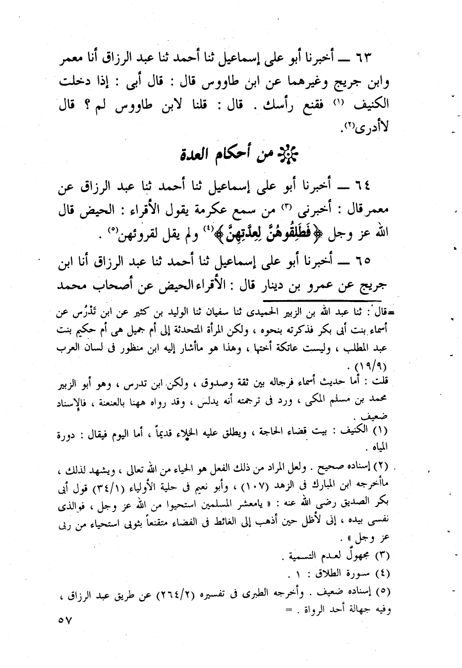 65 - أَخْبَرَنَا أَبُو عَلِيٍّ إِسْمَاعِيلُ، ثَنَا أَحْمَدُ، ثَنَا عَبْدُ الرَّزَاقِ، أنا ابْنُ جُرَيْجٍ، عَنْ عَمْرِو بْنِ دِينَارٍ، قَالَ: §الْأَقْرَاءُ الْحَيْضُ، عَنْ أَصْحَابِ مُحَمَّدٍ صَلَّى اللهُ عَلَيْهِ وَسَلَّمَ، -[58]- فَأَمَّا قَوْلُ ابْنِ عُمَرَ فَإِنَّمَا أَخَذَهُ مِنْ زَيْدِ بْنِ ثَابِتٍ