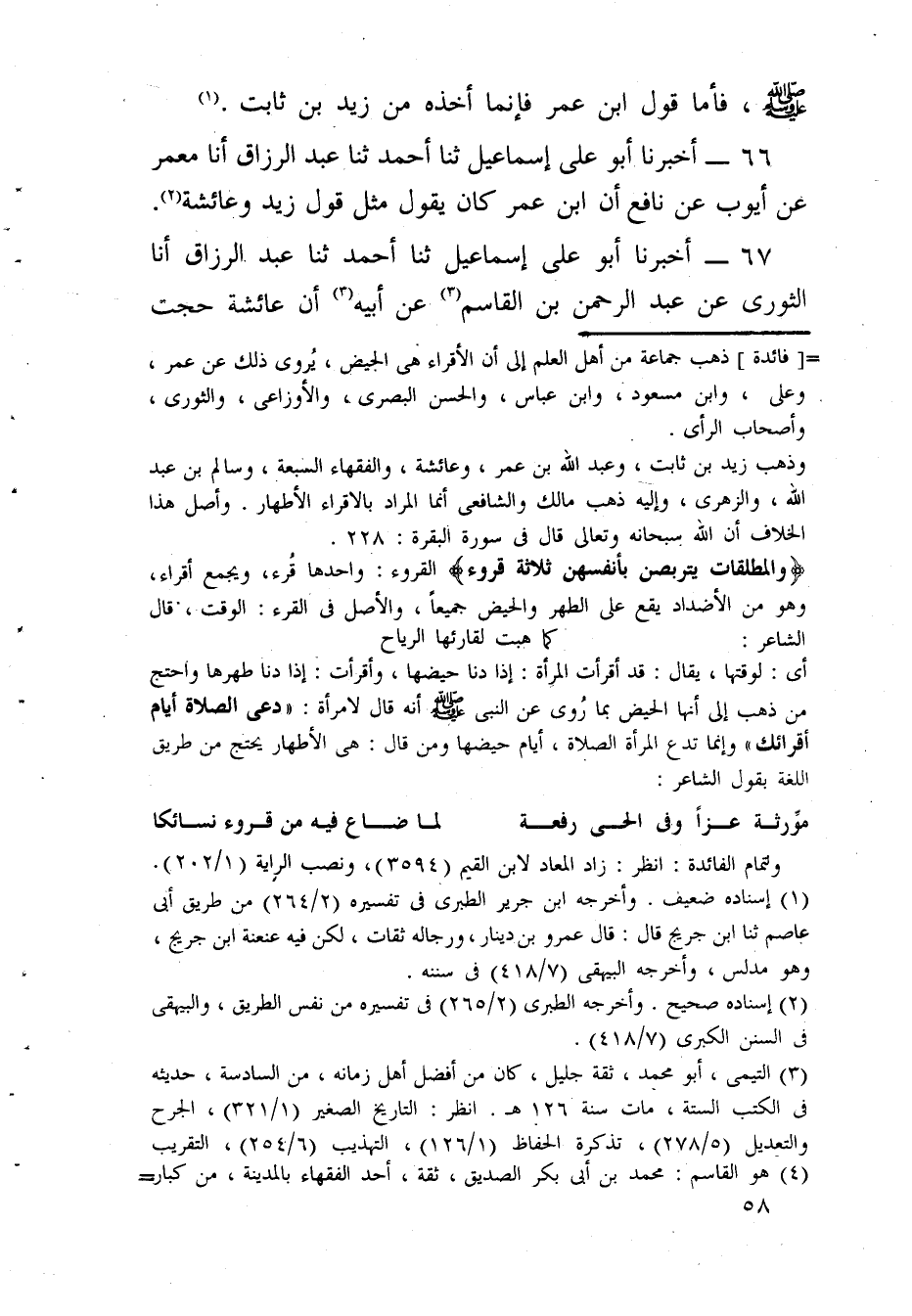 67 - أَخْبَرَنَا أَبُو عَلِيٍّ إِسْمَاعِيلُ، ثَنَا أَحْمَدُ، ثَنَا عَبْدُ الرَّزَاقِ، أنا الثَّوْرِيُّ، عَنْ عَبْدِ الرَّحْمَنِ بْنِ الْقَاسِمِ، عَنْ أَبِيهِ، أَنَّ عَائِشَةَ، §حَجَّتْ -[59]- بِأُخْتِهَا فِي عِدَّتِهَا وَكَانَتِ الْفِتْنَةُ وَخَوْفُهَا قَالَ الثَّوْرِيُّ: فَأَخْبَرَنِي عُبَيْدُ اللَّهِ بْنُ عُمَرَ قَالَ: سَمِعْتُ الْقَاسِمَ بْنَ مُحَمَّدٍ يَقُولُ: أَبَى النَّاسُ ذَلِكَ عَلَيْهَا