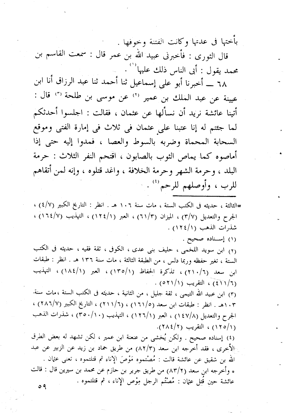 68 - أَخْبَرَنَا أَبُو عَلِيٍّ إِسْمَاعِيلُ، ثَنَا أَحْمَدُ، ثَنَا عَبْدُ الرَّزَاقِ، أنا ابْنُ عُيَيْنَةَ، عَنْ عَبْدِ الْمَلِكِ بْنِ عُمَيْرٍ، عَنْ مُوسَى بْنِ طَلْحَةَ، قَالَ: أَتَيْنَا عَائِشَةَ نُرِيدُ أَنْ نَسْأَلَهَا عَنْ عُثْمَانَ فَقَالَتْ: اجْلِسُوا أُحَدِّثْكُمْ لِمَا جِئْتُمْ لَهُ، إِنَّا عَتَبْنَا عَلَى عُثْمَانَ فِي ثَلَاثٍ: فِي §إِمَارَةِ الْفَتَى وَمَوْقِعِ السَّحَابَةِ الْمُحْمَاةِ وَضَرْبِهٍ بِالسَّوْطِ وَالْعَصَا، فَمَدُّوا إِلَيْهِ حَتَّى إِذَا أَمَاصُوهُ كَمَا يُمَاصُ الثَّوْبُ بِالصَّابُونِ اقْتَحَمَ النَّفْرُ الثَّلَاثُ حُرْمَةَ الْبَلَدِ وَحُرْمَةَ الشَّهْرِ وَحُرْمَةَ الْخِلَافَةِ، وَافِدٌ قَتَلُوهُ وَإِنَّهُ لَمِنْ أَتْقَاهُمْ لِلرَّبِّ وَأَوْصَلِهِمْ لِلرَّحِمِ