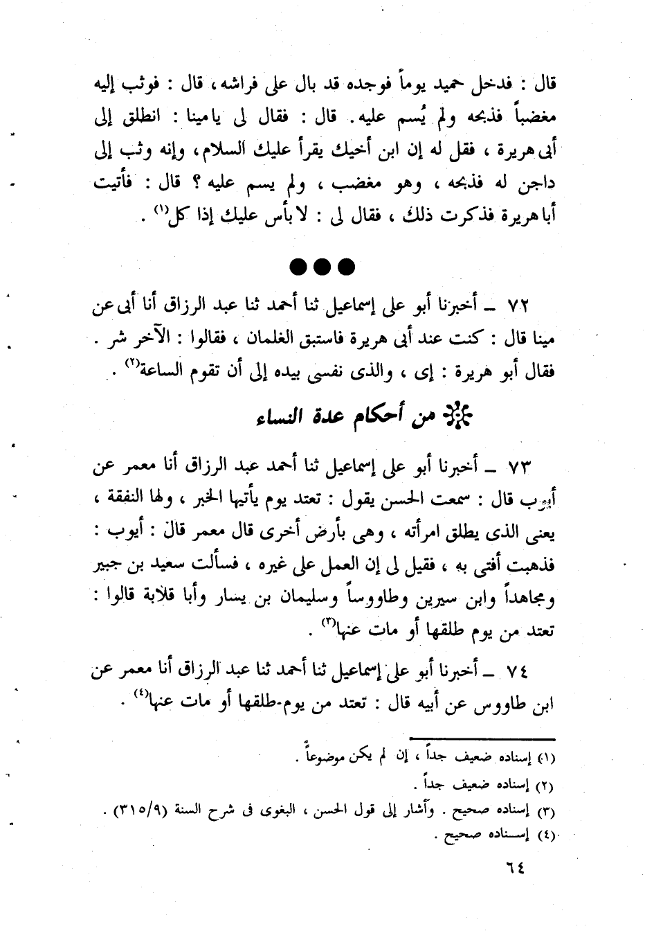 73 - أَخْبَرَنَا أَبُو عَلِيٍّ إِسْمَاعِيلُ، ثَنَا أَحْمَدُ، ثَنَا عَبْدُ الرَّزَاقِ، أنا مَعْمَرٌ، عَنْ أَيُّوبَ، قَالَ: سَمِعْتُ الْحَسَنَ، يَقُولُ: §تَعْتَدُّ يَوْمَ يَأْتِيهَا الْخَبَرُ وَلَهَا النَّفَقَةُ، يَعْنِي الَّذِي يُطَلِّقُ امْرَأَتَهُ وَهِيَ بِأَرْضٍ أُخْرَى قَالَ مَعْمَرٌ: قَالَ أَيُّوبُ: فَذَهَبْتُ أُفْتِي بِهِ فَقِيلَ لِي: إِنَّ الْعَمَلَ عَلَى غَيْرِهِ فَسَأَلْتُ سَعِيدَ بْنَ جُبَيْرٍ وَمُجَاهِدًا وَابْنَ سِيرِينَ وَطَاوُوسًا وَسُلَيْمَانَ بْنَ يَسَارٍ وَأَبَا قِلَابَةَ قَالُوا: تَعْتَدُّ مِنْ يَوْمِ طَلَّقَهَا أَوْ مَاتَ عَنْهَا