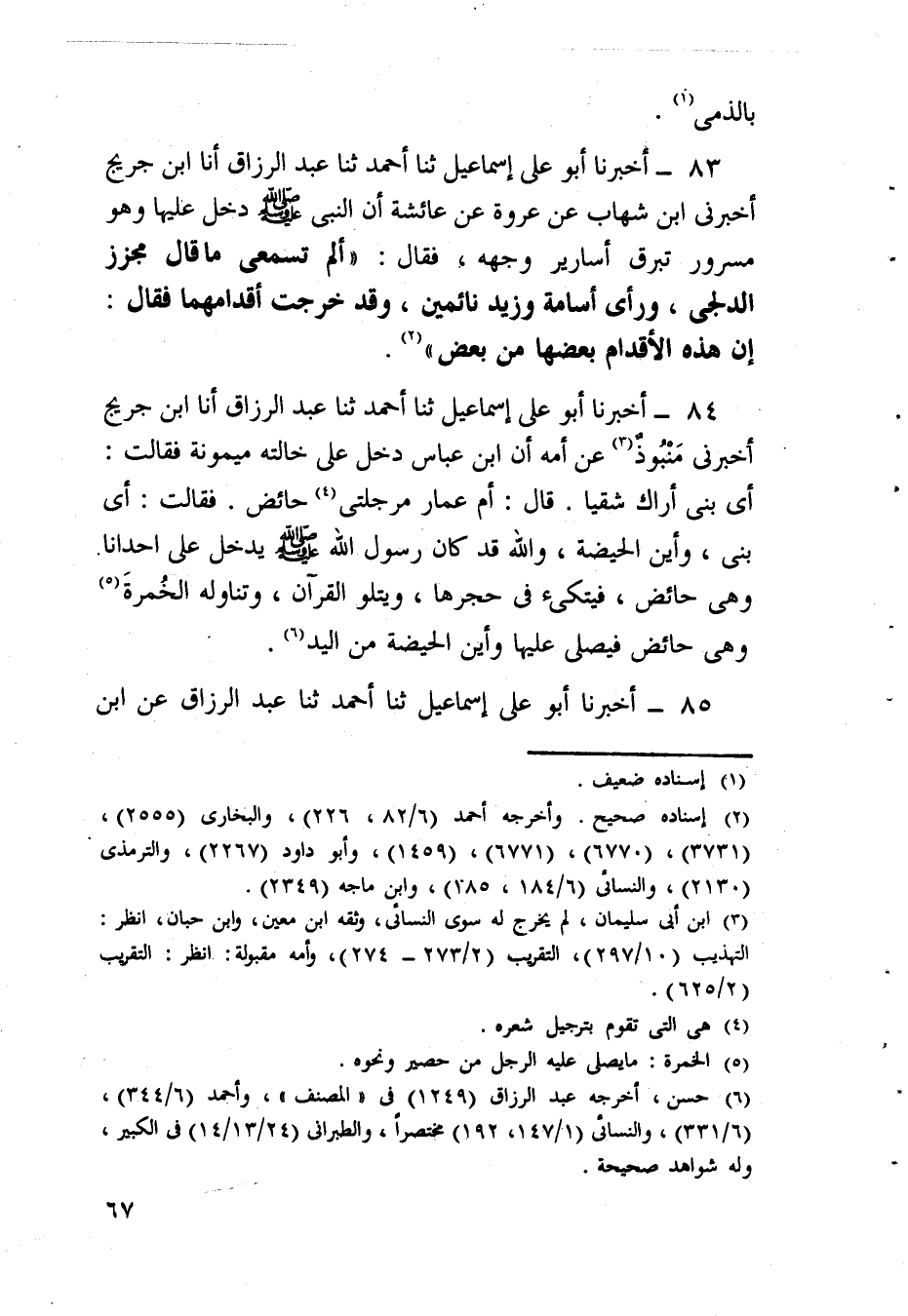 83 - أَخْبَرَنَا أَبُو عَلِيٍّ إِسْمَاعِيلُ، ثَنَا أَحْمَدُ، ثَنَا عَبْدُ الرَّزَاقِ، أنا ابْنُ جُرَيْجٍ، أَخْبَرَنِي ابْنُ شِهَابٍ، عَنْ عُرْوَةَ، عَنْ عَائِشَةَ، أَنَّ النَّبِيَّ صَلَّى اللهُ عَلَيْهِ وَسَلَّمَ دَخَلَ عَلَيْهَا وَهُوَ مَسْرُورٌ تَبْرُقُ أَسَارِيرُ وَجْهِهِ فَقَالَ: «أَلَمْ تَسْمَعِي مَا قَالَ مُجَزِّزٌ الْمُدْلِجِيُّ؟» وَرَأَى أُسَامَةَ وَزَيْدًا نَائِمَيْنِ وَقَدْ خَرَجَتْ أَقْدَامُهُمَا فَقَالَ: إِنَّ §هَذِهِ الْأَقْدَامَ بَعْضُهَا مِنْ بَعْضٍ