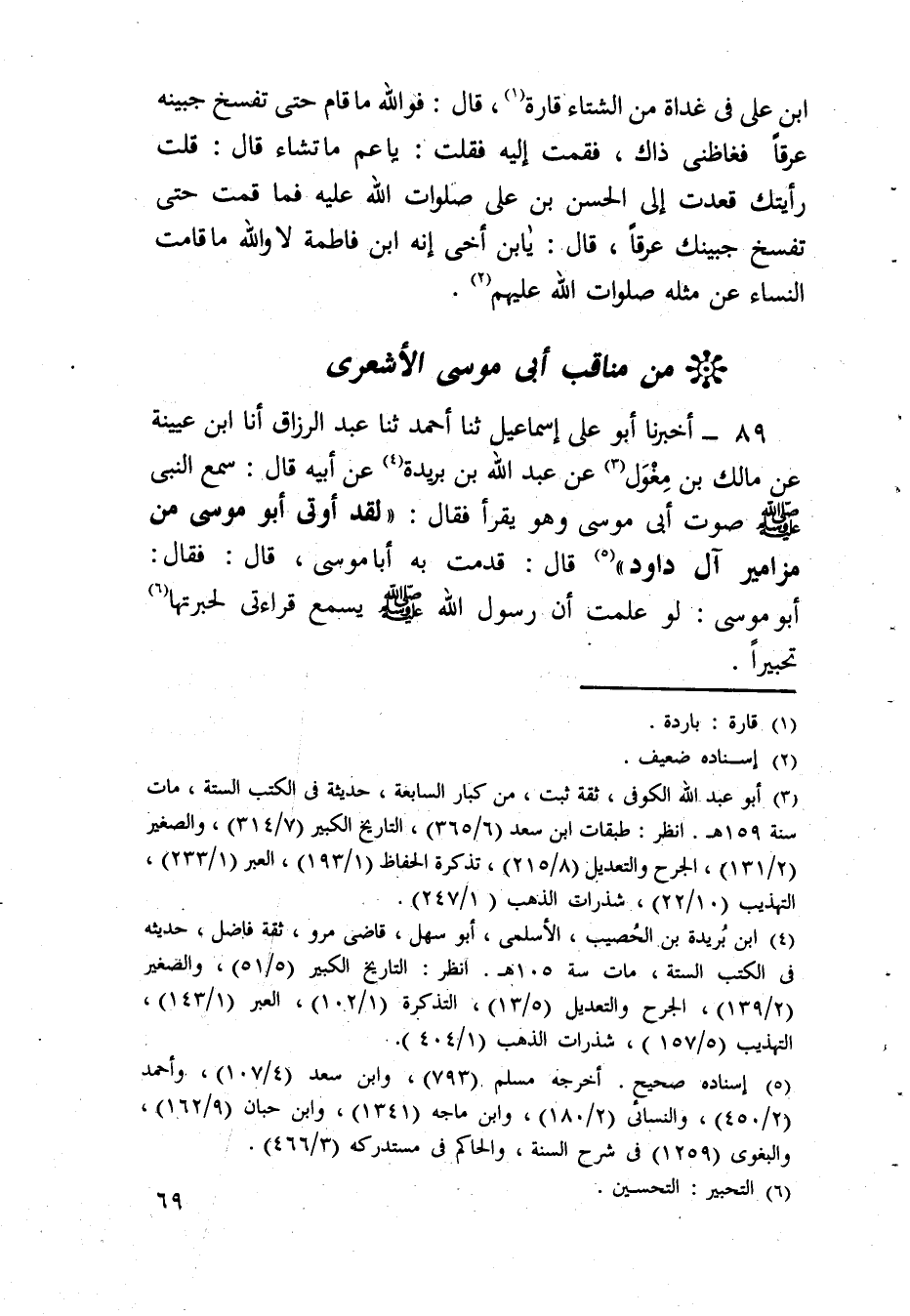 89 - أَخْبَرَنَا أَبُو عَلِيٍّ إِسْمَاعِيلُ، ثَنَا أَحْمَدُ، ثَنَا عَبْدُ الرَّزَاقِ، أنا ابْنُ عُيَيْنَةَ، عَنْ مَالِكِ بْنِ مِغْوَلٍ، عَنْ عَبْدِ اللَّهِ بْنِ بُرَيْدَةَ، عَنْ أَبِيهِ، قَالَ: سَمِعَ النَّبِيُّ صَلَّى اللهُ عَلَيْهِ وَسَلَّمَ صَوْتَ أَبِي مُوسَى، وَهُوَ يَقْرَأُ فَقَالَ: «لَقَدْ §أُوتِيَ أَبُو مُوسَى مِنْ مَزَامِيرِ آلِ دَاوُدَ» قَالَ: قَدِمْتُ بِهِ أَبَا مُوسَى قَالَ: فَقَالَ أَبُو مُوسَى: لَوْ عَلِمْتُ أَنَّ رَسُولَ اللَّهِ صَلَّى اللهُ عَلَيْهِ وَسَلَّمَ يَسْمَعُ قِرَاءَتِي لَحَبَّرْتُهَا تَحْبِيرًا