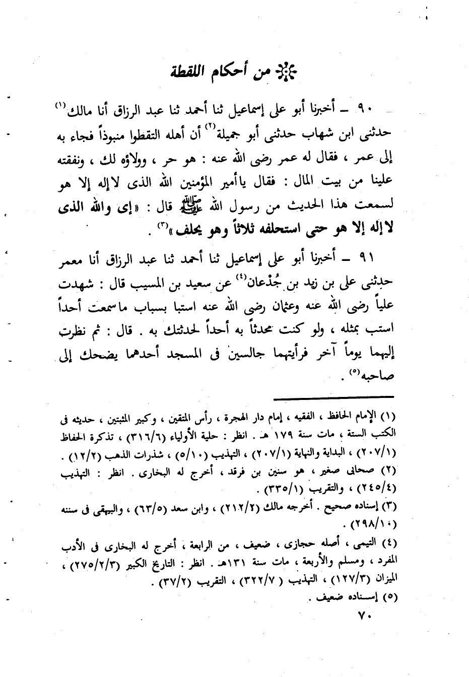 90 - أَخْبَرَنَا أَبُو عَلِيٍّ إِسْمَاعِيلُ، ثَنَا أَحْمَدُ، ثَنَا عَبْدُ الرَّزَاقِ، أنا مَالِكٌ، حَدَّثَنِي ابْنُ شِهَابٍ، حَدَّثَنِي أَبُو جَمِيلَةَ، أَنَّ أَهْلَهُ §الْتَقَطُوا، مَنْبُوذًا فَجَاءَ بِهِ إِلَى عُمَرَ فَقَالَ لَهُ عُمَرُ رَضِيَ اللَّهُ عَنْهُ: هُوَ حُرٌّ وَوَلَاؤُهُ لَكَ وَنَفَقَتُهُ عَلَيْنَا مِنْ بَيْتِ الْمَالِ، فَقَالَ: يَا أَمِيرَ الْمُؤْمِنِينَ، آللَّهِ الَّذِي لَا إِلَهَ إِلَّا هُوَ لَسَمِعْتَ هَذَا الْحَدِيثَ مِنْ رَسُولِ اللَّهِ صَلَّى اللهُ عَلَيْهِ وَسَلَّمَ؟ قَالَ: إِي وَاللَّهِ الَّذِي لَا إِلَهَ إِلَّا هُوَ حَتَّى اسْتَحْلَفَهُ ثَلَاثًا وَهُوَ يَحْلِفُ