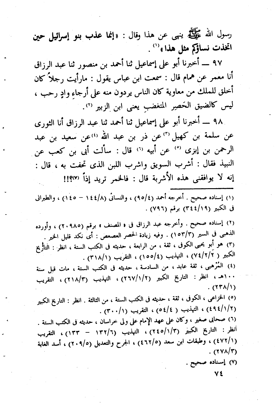 98 - أَخْبَرَنَا أَبُو عَلِيٍّ إِسْمَاعِيلُ، ثَنَا أَحْمَدُ، ثَنَا عَبْدُ الرَّزَاقِ، أنا الثَّوْرِيُّ، عَنْ سَلَمَةَ بْنِ كُهَيْلٍ، عَنْ ذَرِّ بْنِ عَبْدِ اللَّهِ، عَنْ سَعِيدِ بْنِ عَبْدِ الرَّحْمَنِ بْنِ أَبْزَى، عَنْ أَبِيهِ، قَالَ: سَأَلْتُ أُبَيَّ بْنَ كَعْبٍ عَنِ النَّبِيذِ، فَقَالَ: §اشْرَبِ السَّوِيقَ وَاشْرَبِ اللَّبَنَ الَّذِي تُحِفَتْ بِهِ قَالَ: إِنَّهُ لَا يُوَافِقُنِي هَذِهِ الْأَشْرِبَةُ، قَالَ: فَالْخَمْرَ تُرِيدُ إِذًا