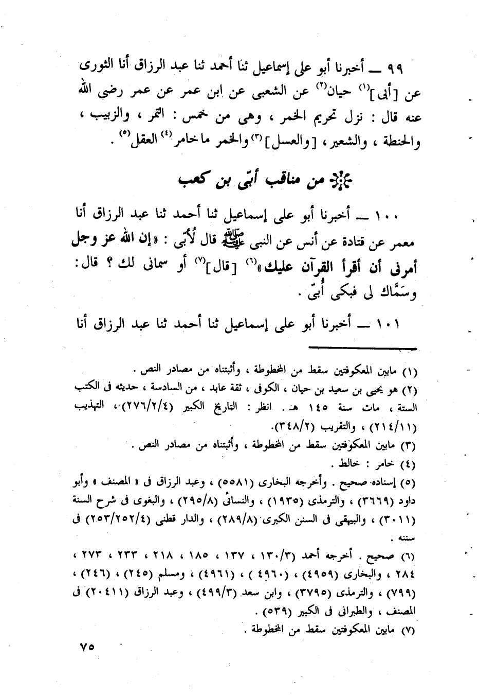 100 - أَخْبَرَنَا أَبُو عَلِيٍّ إِسْمَاعِيلُ، ثَنَا أَحْمَدُ، ثَنَا عَبْدُ الرَّزَاقِ، أنا مَعْمَرٌ، عَنْ قَتَادَةَ، عَنْ أَنَسٍ عَنِ النَّبِيِّ، صَلَّى اللهُ عَلَيْهِ وَسَلَّمَ قَالَ لِأُبَيٍّ: «إِنَّ اللَّهَ عَزَّ وَجَلَّ أَمَرَنِي أَنْ §أَقْرَأَ الْقُرْآنَ عَلَيْكَ» قَالَ: أَوَسَمَّانِي لَكَ؟ قَالَ: «وَسَمَّاكَ لِي» فَبَكَى أُبَيٌّ