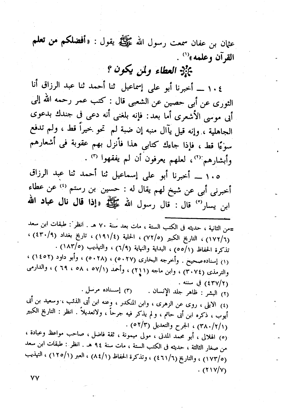 104 - أَخْبَرَنَا أَبُو عَلِيٍّ إِسْمَاعِيلُ، ثَنَا أَحْمَدُ، ثَنَا عَبْدُ الرَّزَاقِ، أنا الثَّوْرِيُّ، عَنْ أَبِي حُصَيْنٍ، عَنِ الشَّعْبِيِّ، قَالَ: كَتَبَ عُمَرُ رَحِمَهُ اللَّهُ إِلَى أَبِي مُوسَى الْأَشْعَرِيِّ: أَمَّا بَعْدُ، فَإِنَّهُ بَلَغَنِي أَنَّهُ §دُعِيَ فِي جُنْدِكَ بِدَعْوَى الْجَاهِلِيَّةِ وَإِنَّهُ قِيلَ: يَا آلَ مُنَبِّهٍ، إِنَّ ضَبَّةَ لَمْ تَحْوِ خَيْرًا قَطُّ وَلَمْ تَدْفَعْ سُوءًا قَطُّ فَإِذَا جَاءَكَ كِتَابِي هَذَا فَأَنْزِلْ بِهِمْ عُقُوبَةً فِي أَشْعَارِهِمْ وَأَبْشَارِهِمْ لَعَلَّهُمْ يَعْرِفُونَ أَنْ لَمْ يَفْقَهُوا