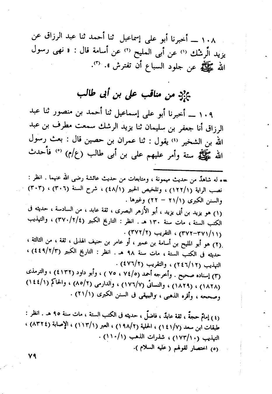 109 - أَخْبَرَنَا أَبُو عَلِيٍّ إِسْمَاعِيلُ، ثَنَا أَحْمَدُ بْنُ مَنْصُورٍ، ثَنَا عَبْدُ الرَّزَاقِ، أنا جَعْفَرُ بْنُ سُلَيْمَانَ، ثنا يَزِيدُ الرِّشْكُ، سَمِعْتُ مُطَرِّفَ بْنَ عَبْدِ اللَّهِ بْنِ الشِّخِّيرِ، يَقُولُ: ثنا عِمْرَانُ بْنُ حُصَيْنٍ، قَالَ: بَعَثَ رَسُولُ اللَّهِ صَلَّى اللهُ عَلَيْهِ وَسَلَّمَ سِتَّةً وَأَمَّرَ عَلَيْهِمْ عَلِيَّ بْنَ أَبِي طَالِبٍ فَأَحْدَثَ -[80]- فِي سَفَرِهِ شَيْئًا فَتَعَاقَدَ أَرْبَعَةٌ مِنْ أَصْحَابِ رَسُولِ اللَّهِ صَلَّى اللهُ عَلَيْهِ وَسَلَّمَ أَنْ يَذْكُرُوا ذَلِكَ لِرَسُولِ اللَّهِ، قَالَ عِمْرَانُ: وَكَانُوا إِذَا قَدِمُوا مِنْ سَفَرٍ بَدَءُوا بِرَسُولِ اللَّهِ صَلَّى اللهُ عَلَيْهِ وَسَلَّمَ فَدَخَلُوا عَلَيْهِ فَقَامَ رَجُلٌ مِنَ الْأَرْبَعَةِ، فَقَالَ: يَا رَسُولَ اللَّهِ، إِنَّ عَلِيًّا صَلَوَاتُ اللَّهِ عَلَيْهِ فَعَلَ كَذَا وَكَذَا فَأَعْرَضَ عَنْهُ، ثُمَّ قَامَ الثَّاني فَقَالَ: يَا رَسُولَ اللَّهِ، إِنَّ عَلِيًّا فَعَلَ كَذَا وَكَذَا فَأَعْرَضَ عَنْهُ، ثُمَّ قَامَ الثَّالِثُ فَقَالَ: يَا رَسُولَ اللَّهِ، إِنَّ عَلِيًّا فَعَلَ كَذَا وَكَذَا فَأَعْرَضَ عَنْهُ، ثُمَّ قَامَ الرَّابِعُ فَقَالَ: إِنَّ عَلِيًّا فَعَلَ كَذَا وَكَذَا فَأَقْبَلَ عَلَيْهِمْ، فَقَالَ: «§دَعُوا عَلِيًّا دَعُوا عَلِيًّا دَعُوا عَلِيًّا، ثَلَاثًا، فَإِنَّ عَلِيًّا مِنِّي وَأَنَا مِنْهُ وَهُوَ وَلِيُّ كُلِّ مُؤْمِنٍ»