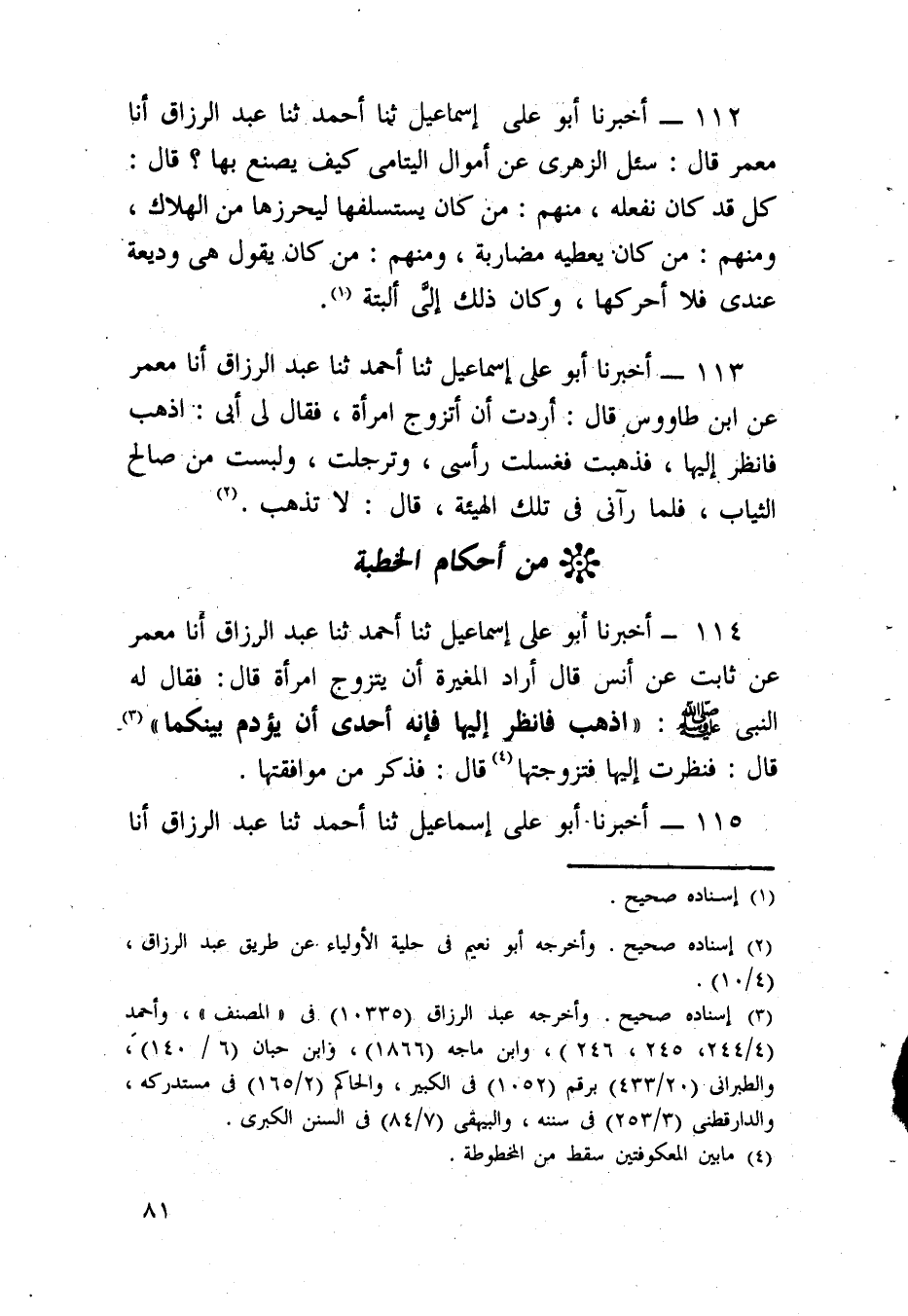 114 - أَخْبَرَنَا أَبُو عَلِيٍّ إِسْمَاعِيلُ، ثَنَا أَحْمَدُ، ثَنَا عَبْدُ الرَّزَاقِ، أنا مَعْمَرٌ، عَنْ ثَابِتٍ، عَنْ أَنَسٍ، قَالَ: أَرَادَ الْمُغِيرَةُ أَنْ يَتَزَوَّجَ امْرَأَةً قَالَ: فَقَالَ لَهُ النَّبِيُّ صَلَّى اللهُ عَلَيْهِ وَسَلَّمَ: §«اذْهَبْ فَانْظُرْ إِلَيْهَا فَإِنَّهُ أَحْرَى أَنْ يُؤْدَمَ بَيْنَكُمَا» قَالَ: فَنَظَرْتُ إِلَيْهَا فَتَزَوَّجْتُهَا قَالَ: فَذَكَرَ مِنْ مُوَافَقَتِهَا