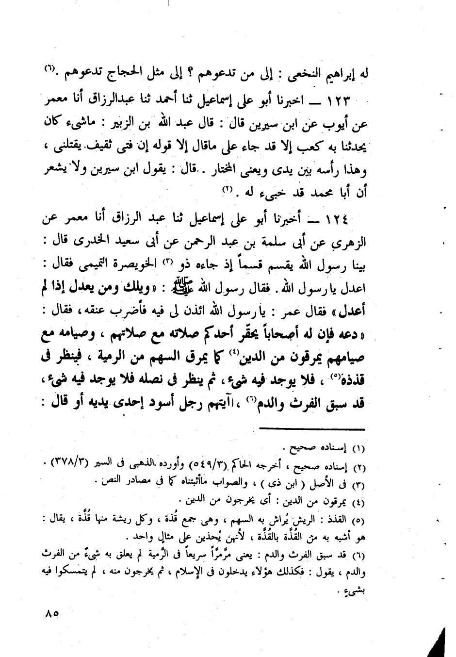 124 - أَخْبَرَنَا أَبُو عَلِيٍّ إِسْمَاعِيلُ، ثَنَا أَحْمَدُ، ثَنَا عَبْدُ الرَّزَاقِ، أنا مَعْمَرٌ، عَنِ الزُّهْرِيِّ، عَنْ أَبِي سَلَمَةَ بْنِ عَبْدِ الرَّحْمَنِ، عَنْ أَبِي سَعِيدٍ الْخُدْرِيِّ، قَالَ: " بَيْنَا رَسُولُ اللَّهِ يَقْسِمُ قَسْمًا إِذْ جَاءَهُ ذُو الْخُوَيْصِرَةِ التَّمِيمِيُّ، فَقَالَ: اعْدِلْ يَا رَسُولَ اللَّهِ. فَقَالَ رَسُولُ اللَّهِ صَلَّى اللهُ عَلَيْهِ وَسَلَّمَ: «وَيْلَكَ §وَمَنْ يَعْدِلُ إِذَا لَمْ أَعْدِلْ» فَقَالَ عُمَرُ: يَا رَسُولَ اللَّهِ، ائْذَنْ لِي فِيهِ فَأَضْرِبْ عُنُقَهُ. فَقَالَ: " دَعْهُ، فَإِنَّ لَهُ أَصْحَابًا يَحْقِرُ أَحَدُكُمْ صَلَاتَهُ مَعَ صَلَاتِهِمْ وَصِيَامَهُ مَعَ صِيَامِهِمْ يَمْرُقُونَ مِنَ الدِّينِ كَمَا يَمْرُقُ السَّهْمُ مِنَ الرَّمِيَّةِ فَيَنْظُرُ فِي قُذَذِهِ فَلَا يُوجَدُ فِيهِ شَيْءٌ ثُمَّ يَنْظُرُ فِي نَصْلِهِ فَلَا يُوجَدُ فِيهِ شَيْءٌ، قَدْ سَبَقَ الْفَرْثَ وَالدَّمَ، آيَتُهُمْ رَجُلٌ أَسْوَدُ إِحْدَى يَدَيْهِ، أَوْ قَالَ: -[86]- مَثَلُ إِحْدَى يَدَيْهِ مَثَلُ حَلَمَةِ ثَدْيِ الْمَرْأَةِ، أَوْ مَثَلُ الْبَضْعَةِ تَدَرْدَرُ، يَخْرُجُونَ عَلَى حِينِ فُرْقَةٍ مِنَ النَّاسِ " فَنَزَلَتْ {وَمِنْهُمْ مَنْ يَلْمِزُكَ فِي الصَّدَقَاتِ} [التوبة: 58] الْآيَةَ قَالَ أَبُو سَعِيدٍ: أَشْهَدُ أَنِّي سَمِعْتُ هَذَا الْحَدِيثَ مِنْ رَسُولِ اللَّهِ صَلَّى اللهُ عَلَيْهِ وَسَلَّمَ، وَأَشْهَدُ أَنَّ عَلِيًّا رَضِيَ اللَّهُ عَنْهُ حِينَ قَتَلَهُمْ وَأَنَا مَعَهُ جِيءَ بِالرَّجُلِ عَلَى النَّعْتِ الَّذِي نَعَتَ رَسُولُ اللَّهِ صَلَّى اللهُ عَلَيْهِ وَسَلَّمَ