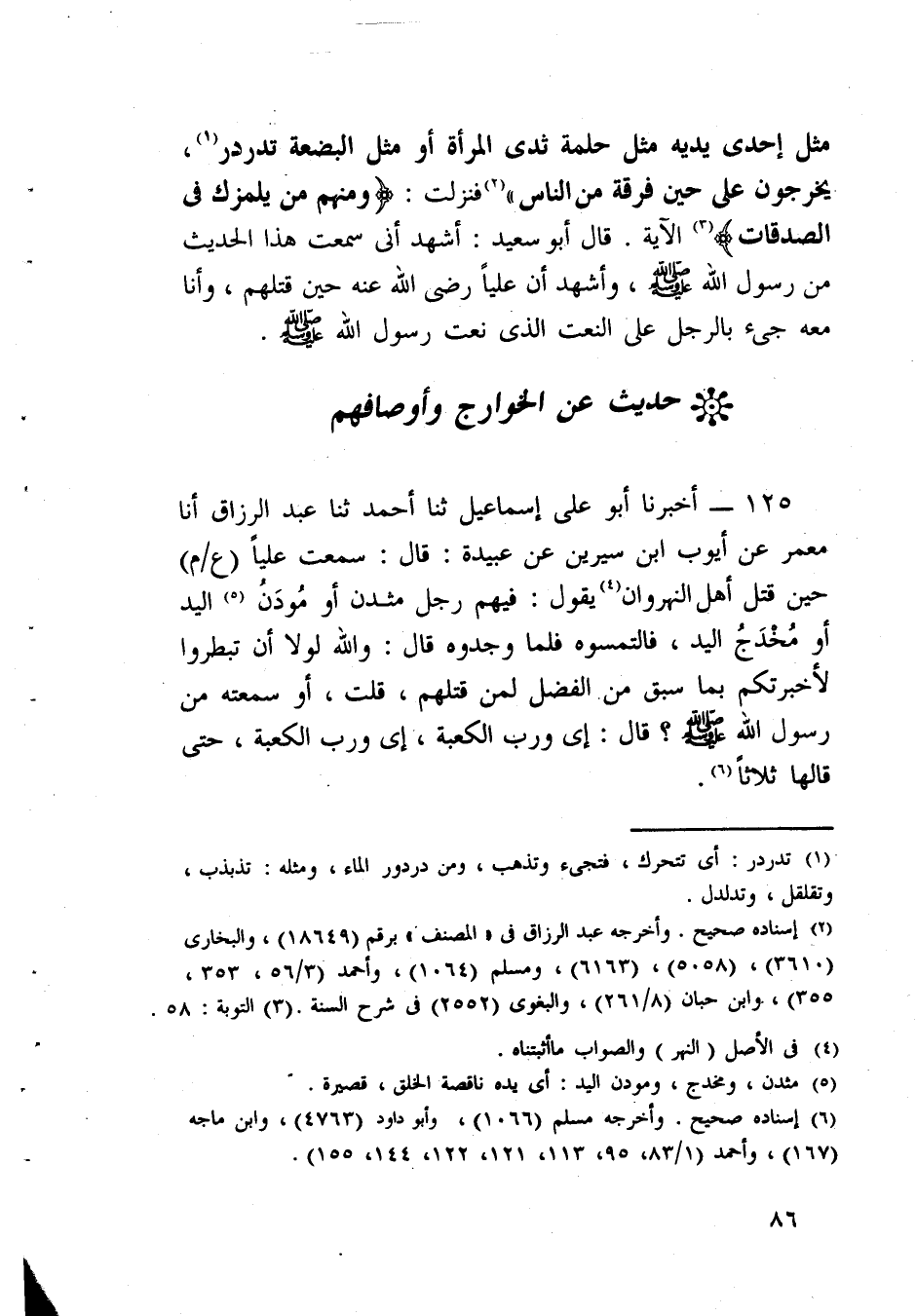 125 - أَخْبَرَنَا أَبُو عَلِيٍّ إِسْمَاعِيلُ، ثَنَا أَحْمَدُ، ثَنَا عَبْدُ الرَّزَاقِ، أنا مَعْمَرٌ، عَنْ أَيُّوبَ عَنِ ابْنِ سِيرِينَ، عَنْ عَبِيدَةَ، قَالَ: سَمِعْتُ عَلِيًّا حِينَ قَتَلَ أَهْلَ النَّهْرَوَانِ يَقُولُ: §" فِيهِمْ رَجُلٌ مُثَدَّنُ أَوْ مُودَنُ الْيَدِ أَوْ مُخْدَجُ الْيَدِ فَالْتَمِسُوهُ فَلَمَّا وَجَدُوهُ قَالَ: وَاللَّهِ لَوْلَا أَنْ تَبْطَرُوا لَأَخْبَرْتُكُمْ بِمَا سَبَقَ مِنَ الْفَضْلِ لِمَنْ قَتَلَهُمْ، قُلْتُ: أَوَسَمِعْتَهُ مِنْ رَسُولِ اللَّهِ صَلَّى اللهُ عَلَيْهِ وَسَلَّمَ؟ قَالَ: إِي وَرَبِّ الْكَعْبَةِ، إِي وَرَبِّ الْكَعْبَةِ، حَتَّى قَالَهَا ثَلَاثًا "