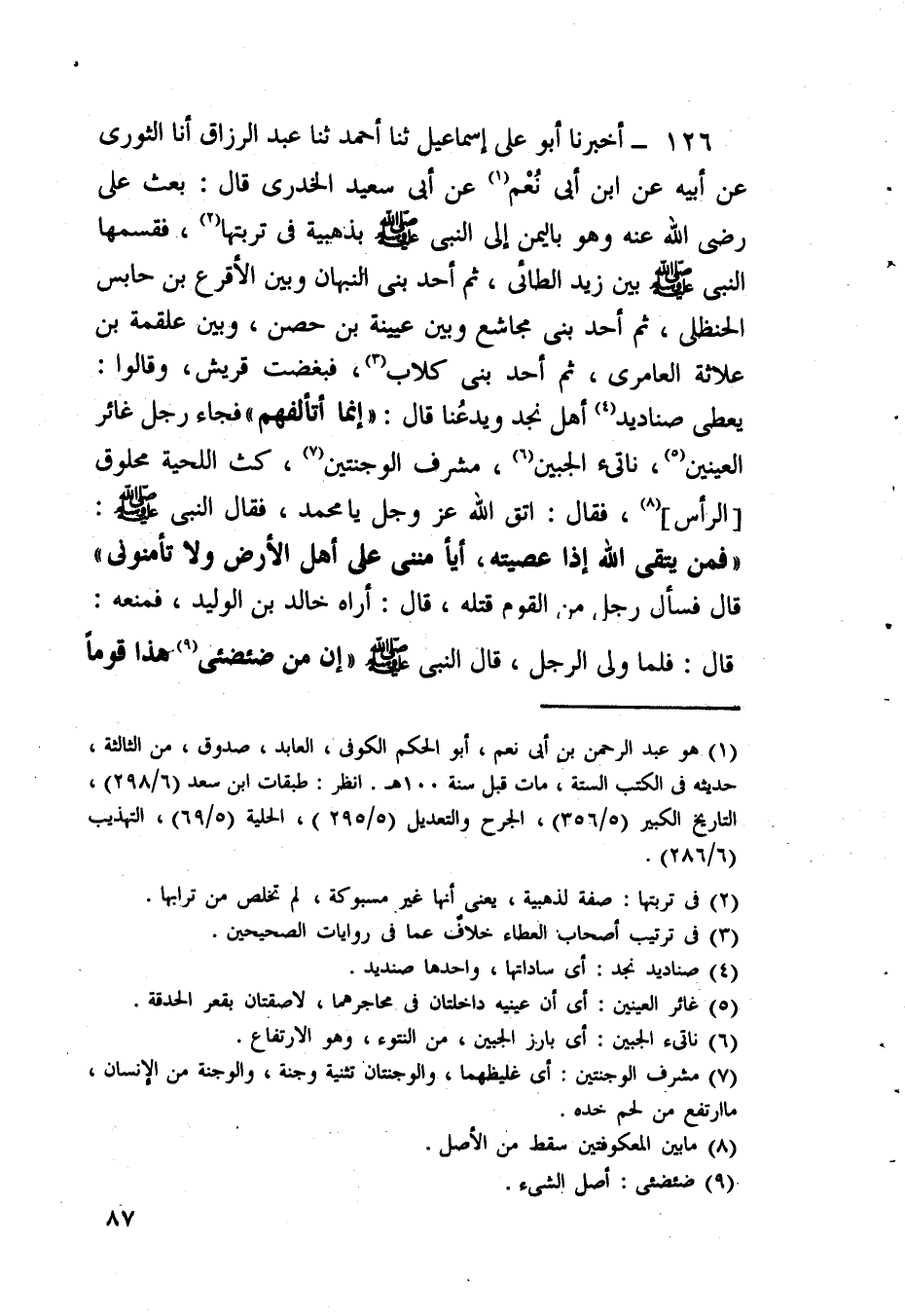 126 - أَخْبَرَنَا أَبُو عَلِيٍّ إِسْمَاعِيلُ، ثَنَا أَحْمَدُ، ثَنَا عَبْدُ الرَّزَاقِ، أنا الثَّوْرِيُّ، عَنْ أَبِيهِ، عَنِ ابْنِ أَبِي نُعْمٍ، عَنْ أَبِي سَعِيدٍ الْخُدْرِيِّ، قَالَ: " بَعَثَ عَلِيٌّ رَضِيَ اللَّهُ عَنْهُ وَهُوَ بِالْيَمَنِ إِلَى النَّبِيِّ صَلَّى اللهُ عَلَيْهِ وَسَلَّمَ بِذَهَبِيَّةٍ فِي تُرْبَتِهَا فَقَسَمَهَا النَّبِيِّ صَلَّى اللهُ عَلَيْهِ وَسَلَّمَ بَيْنَ زَيْدٍ الطَّائِيِّ ثُمَّ أَحَدِ بَنِي النَّبْهَانِ وَبَيْنَ الْأَقْرَعِ بْنِ حَابِسٍ الْحَنْظَلِيِّ ثُمَّ أَحَدِ بَنِي مُجَاشِعٍ وَبَيْنَ عُيَيْنَةَ بْنِ حِصْنٍ وَبَيْنَ عَلْقَمَةَ بْنِ عُلَاثَةَ الْعَامِرِيِّ ثُمَّ أَحَدِ بَنِي كِلَابٍ فَبَغَضَتْ قُرَيْشٌ وَقَالُوا: يُعْطِي صَنَادِيدَ أَهْلِ نَجْدٍ وَيَدَعُنَا، قَالَ: «إِنَّمَا أَتَأَلَّفُهُمْ» فَجَاءَ رَجُلٌ غَائِرُ الْعَيْنَيْنِ نَاتِئُ الْجَبِينِ مُشْرِفُ الْوَجْنَتَيْنِ كَثٌّ اللِّحْيَةِ مَحْلُوقُ الرَّأْسِ فَقَالَ: اتَّقِ اللَّهَ عَزَّ وَجَلَّ يَا مُحَمَّدُ. فَقَالَ النَّبِيُّ صَلَّى اللهُ عَلَيْهِ وَسَلَّمَ: «فَمَنْ يَتَّقِي اللَّهَ إِذَا عَصَيْتُهُ أَيَأْمَنُنِي عَلَى أَهْلِ الْأَرْضِ وَلَا تَأْمَنُونِي؟» قَالَ: فَسَأَلَ رَجُلٌ مِنَ الْقَوْمِ قَتْلَهُ، قَالَ: أُرَاهُ خَالِدَ بْنَ الْوَلِيدِ فَمَنَعَهُ قَالَ: فَلَمَّا وَلَّى الرَّجُلُ قَالَ النَّبِيُّ صَلَّى اللهُ عَلَيْهِ وَسَلَّمَ: «إِنَّ مِنْ ضِئْضِئِ هَذَا قَوْمًا -[88]- يَقْرَءُونَ الْقُرْآنَ لَا يُجَاوِزُ حَنَاجِرَهُمْ يَمْرُقُونَ مِنَ الْإِسْلَامِ كَمَا يَمْرُقُ السَّهْمُ مِنَ الرَّمِيَّةِ §يَقْتُلُونَ أَهْلَ الْإِسْلَامِ وَيَدَعُونَ أَهْلَ الْأَوْثَانِ لَئِنْ لَقِيتُهُمْ لَأَقْتُلَنَّهُمْ قَتْلَ عَادٍ»