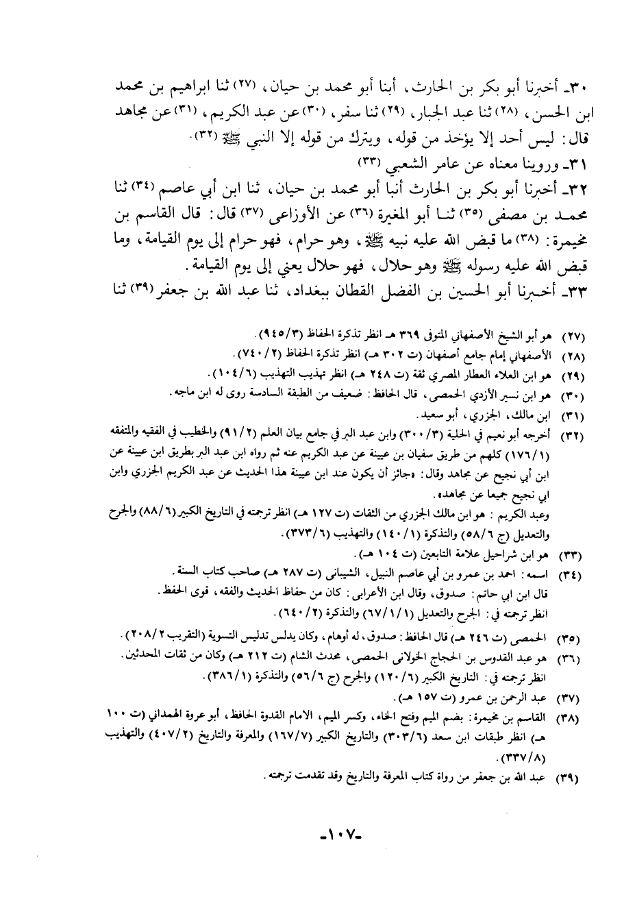 30 - أَخْبَرَنَا أَبُو بَكْرِ بْنُ الْحَارِثِ، أبنا أَبُو مُحَمَّدِ بْنُ حَيَّانَ، ثنا إِبْرَاهِيمُ بْنُ مُحَمَّدِ بْنِ الْحَسَنِ، ثنا عَبْدُ الْجَبَّارِ، ثنا سَفَرٌ، عَنْ عَبْدِ الْكَرِيمِ، عَنْ مُجَاهِدٍ قَالَ: §«لَيْسَ أَحَدٌ إِلَّا يُؤْخَذُ مِنْ قَوْلِهِ وَيُتْرَكُ مِنْ قَوْلِهِ إِلَّا النَّبِيَّ صَلَّى اللهُ عَلَيْهِ وَسَلَّمَ»